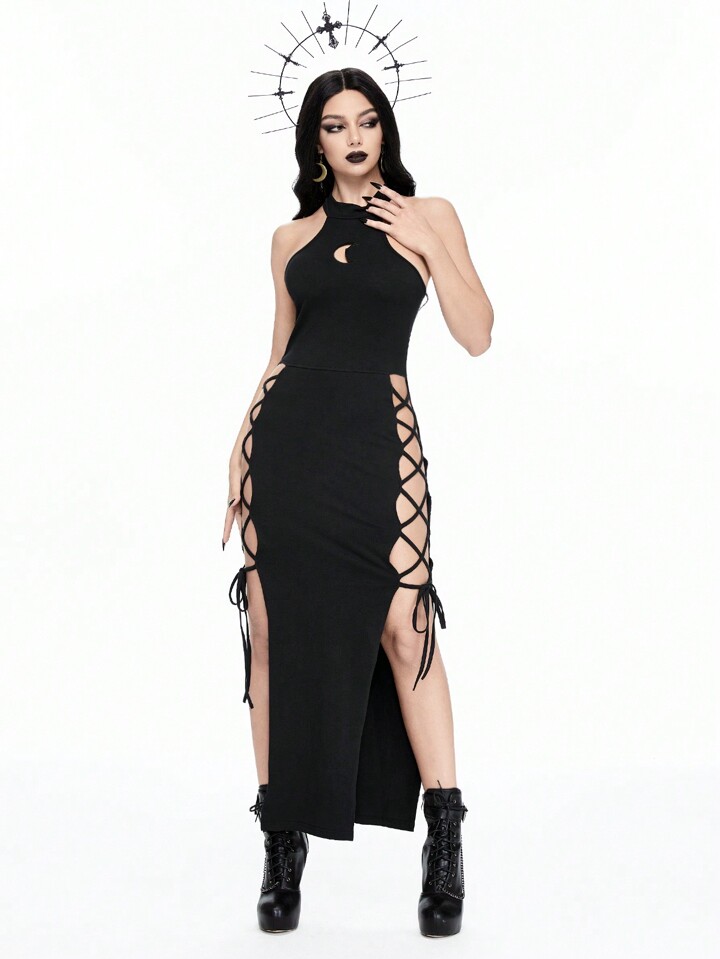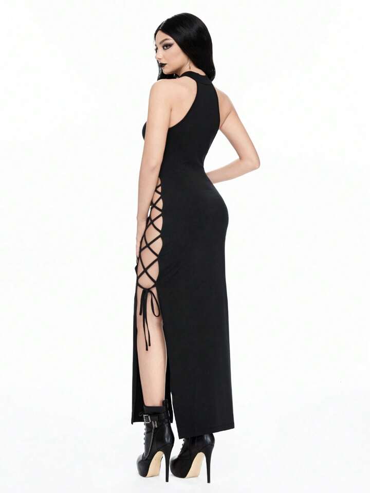 Goth Robe noire mystérieuse et sexy à fente haute, à bretelles, sans dos et sans manches pour femmes