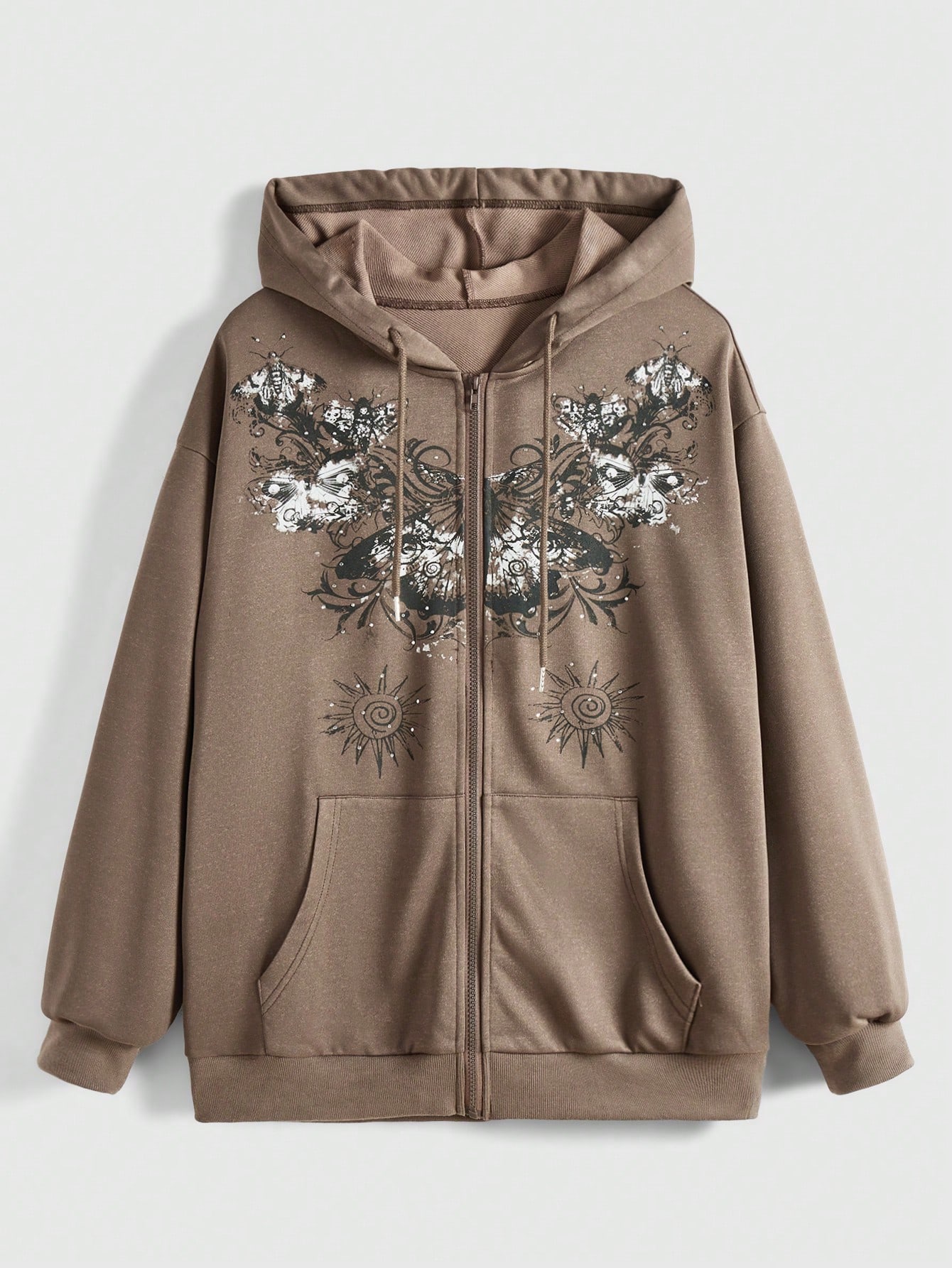 Goth Sweat-Shirt À Capuche Imprimé Papillon Zippé À Cordon