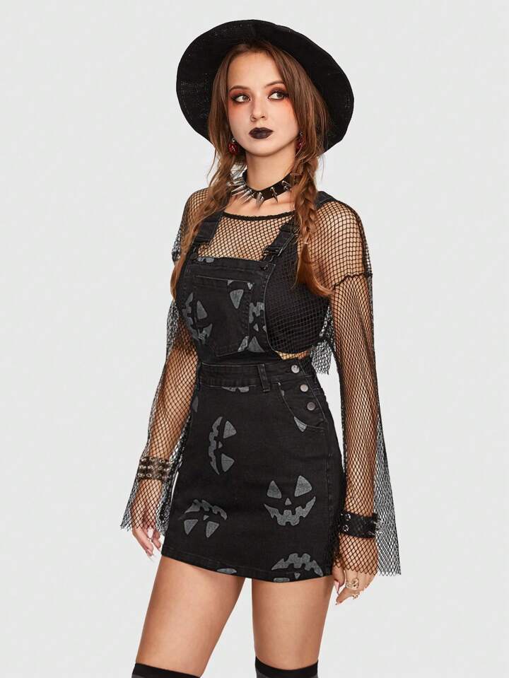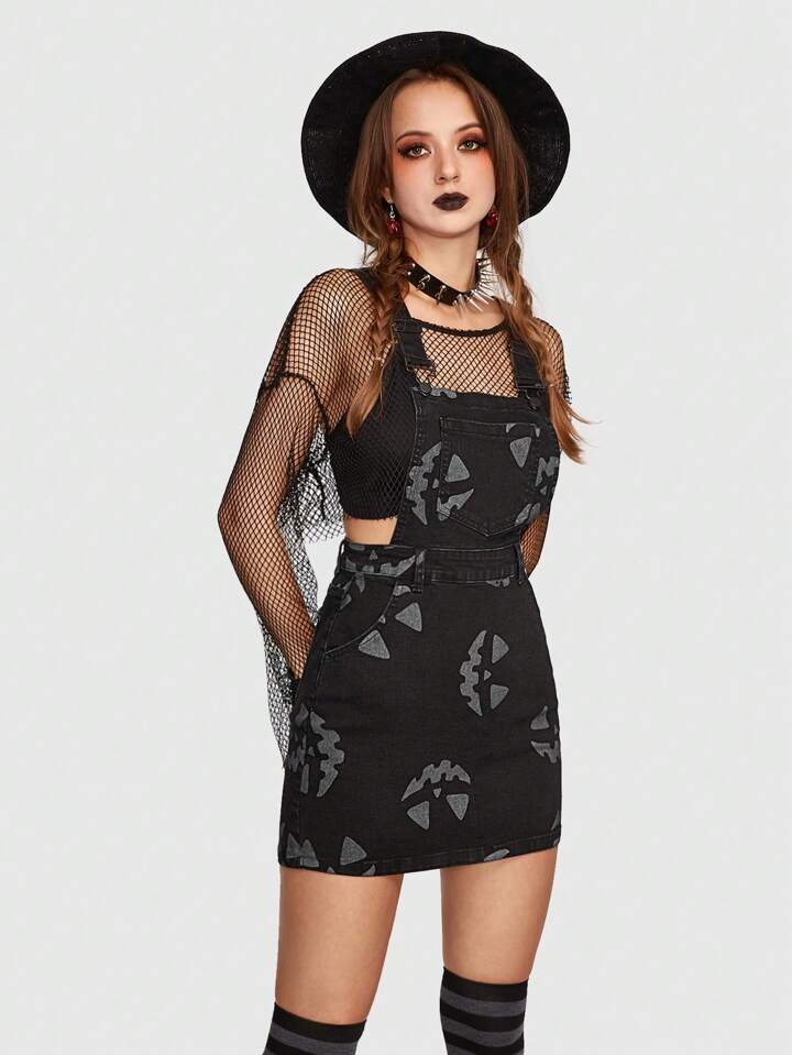 Goth Robe En Jean Imprimé Dessin Animé Moulant À Fines Brides (Sans Top)