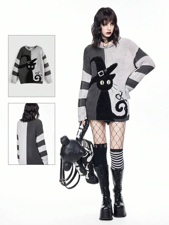 Goth Pull ample col rond à motif intarsia de chat noir mystérieux, rayures et yin yang