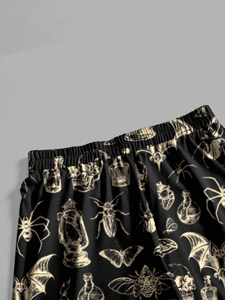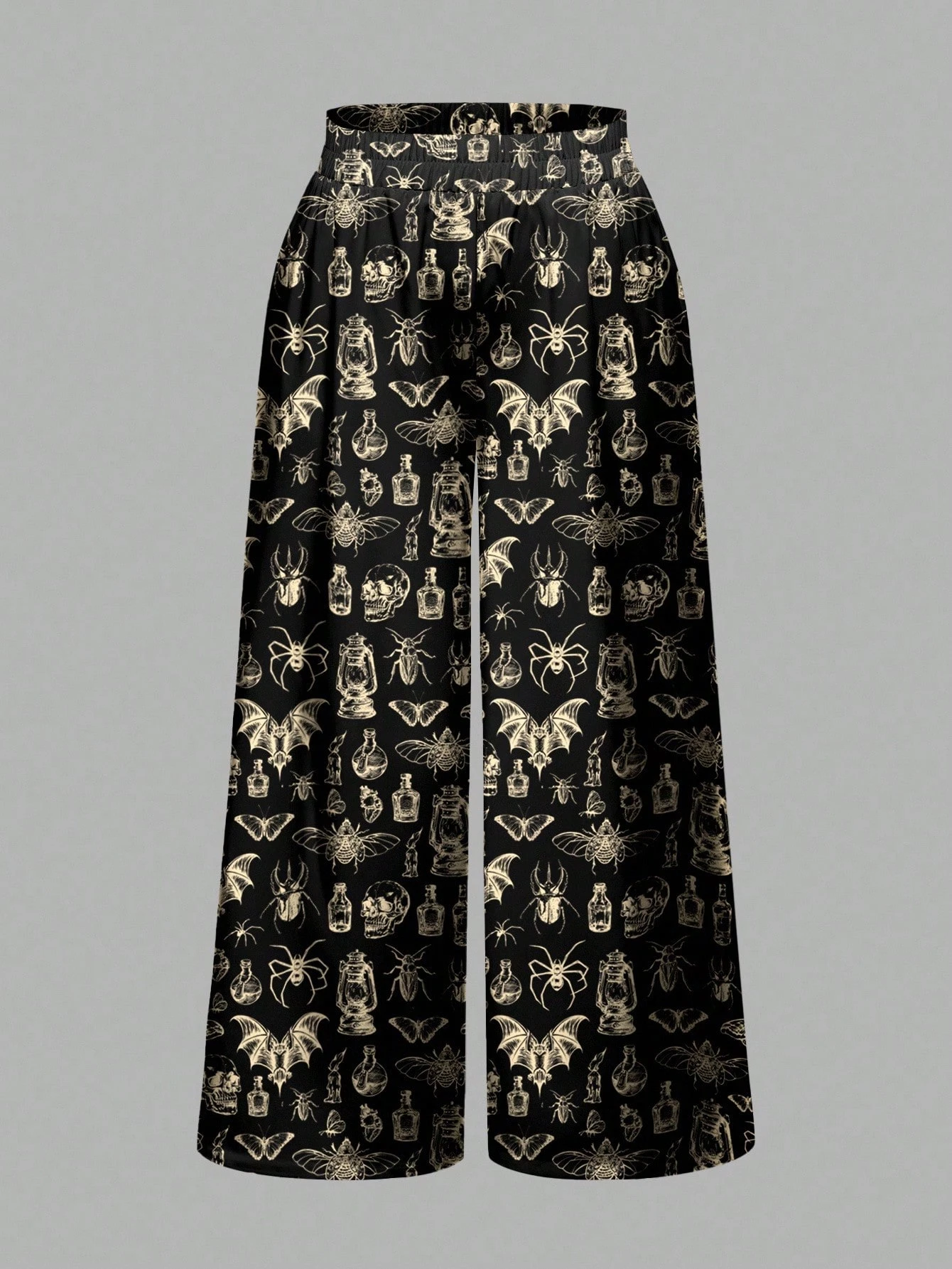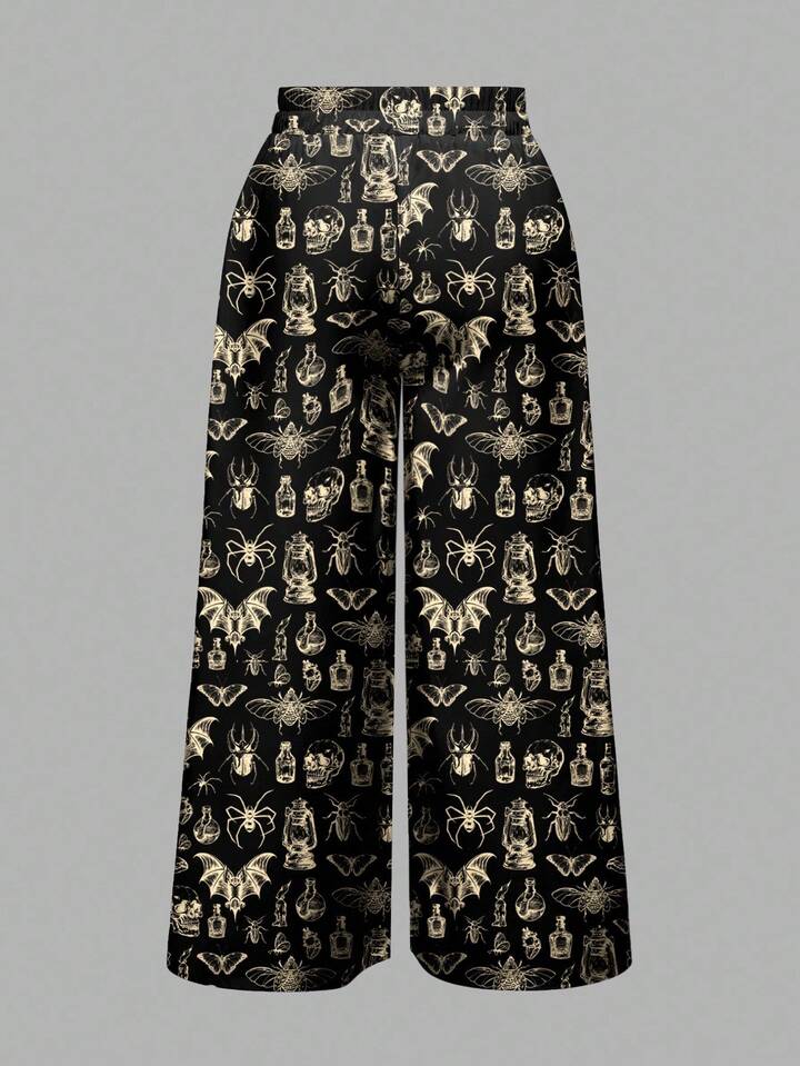 Goth Pantalon grande taille noir et beige, style expérimental académique, avec motifs de sorcière, papillon de nuit, forêt, araignée et chauve-souris pour un look mystérieux et effrayant