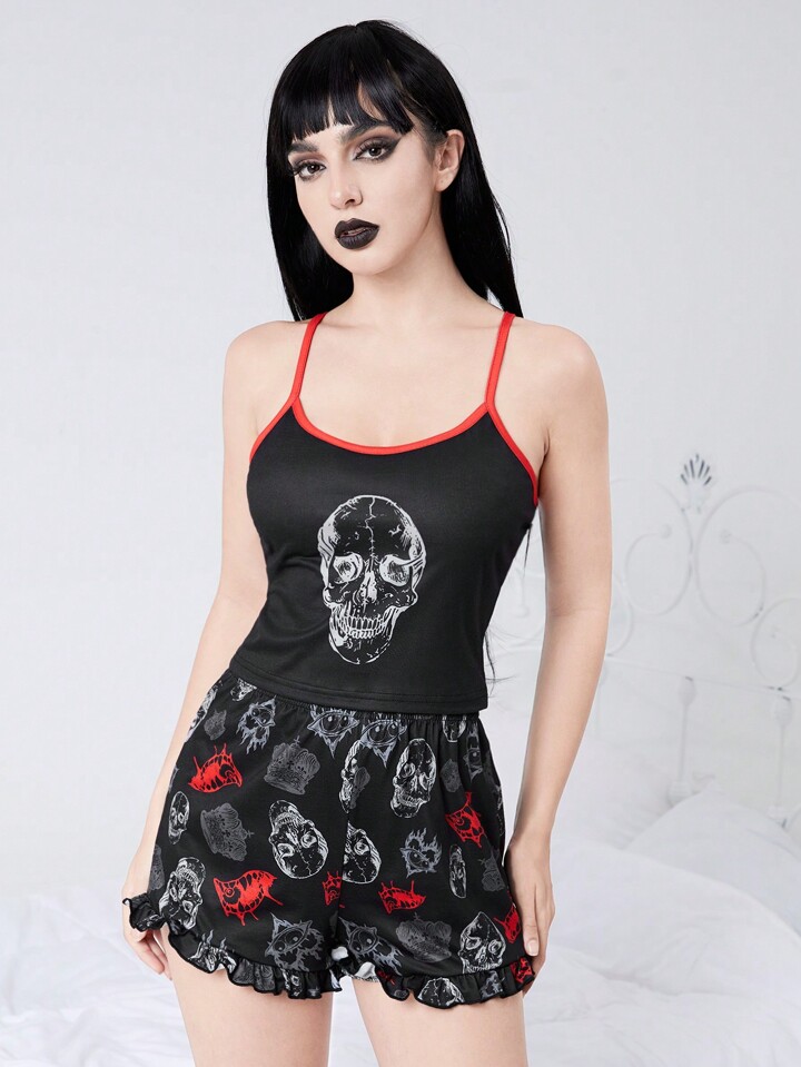 Goth Ensemble de pyjama tricoté simple avec crâne noir, dents et couronne, style camisole, école