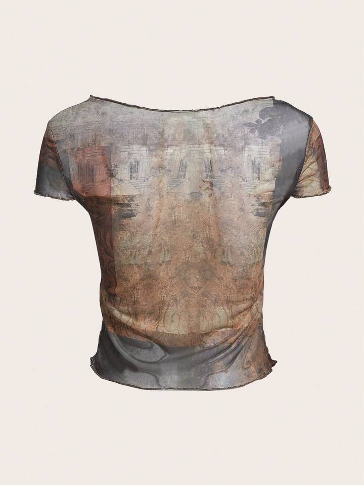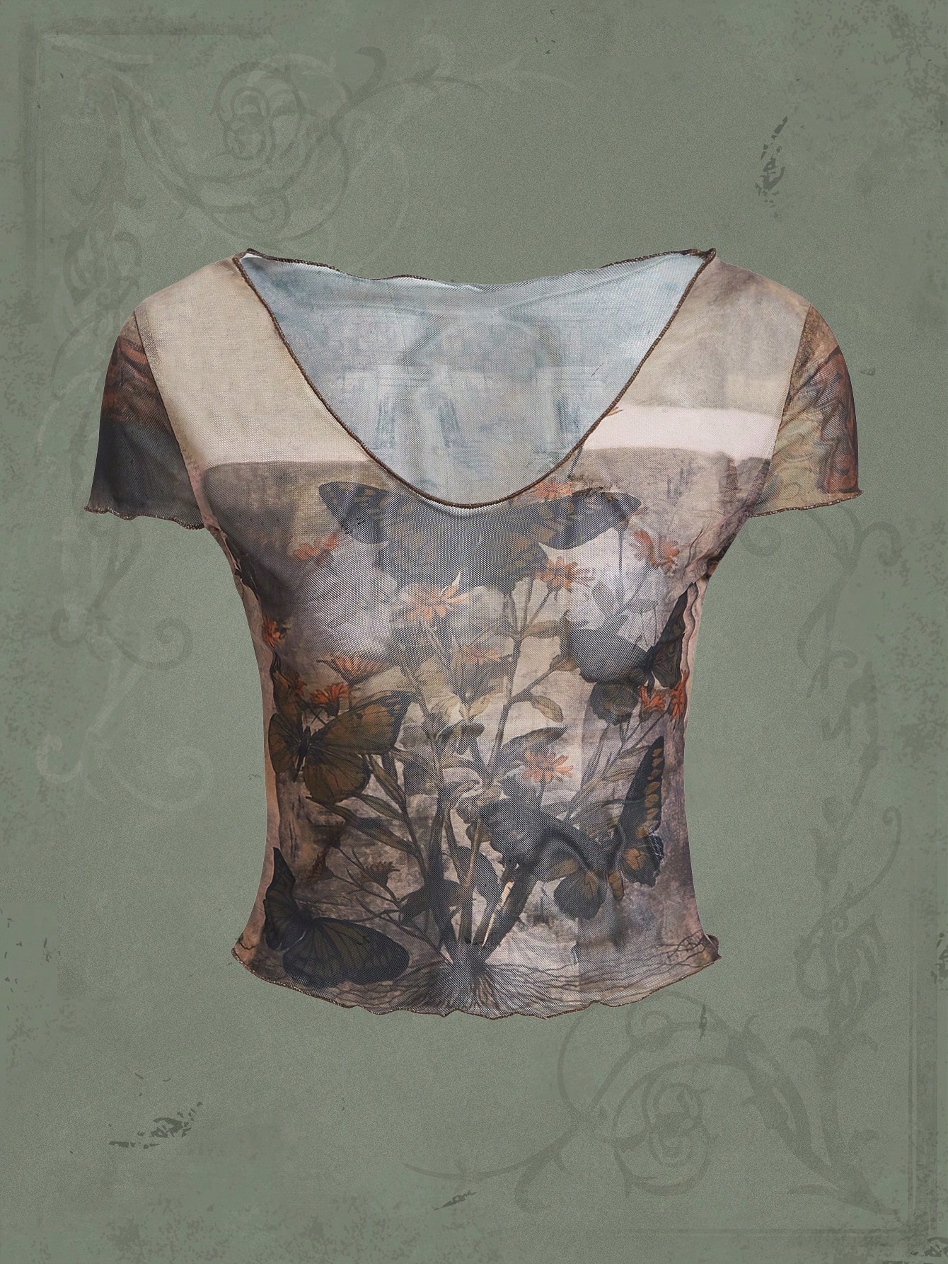 Goth Top Imprimé Floral Et Papillon À Ourlet Ondulé En Tulle