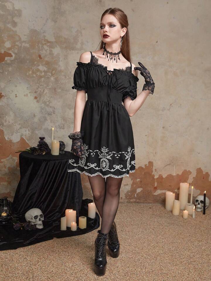 Goth Robe Brodé Fleur En Dentelle À Épaules Dénudées