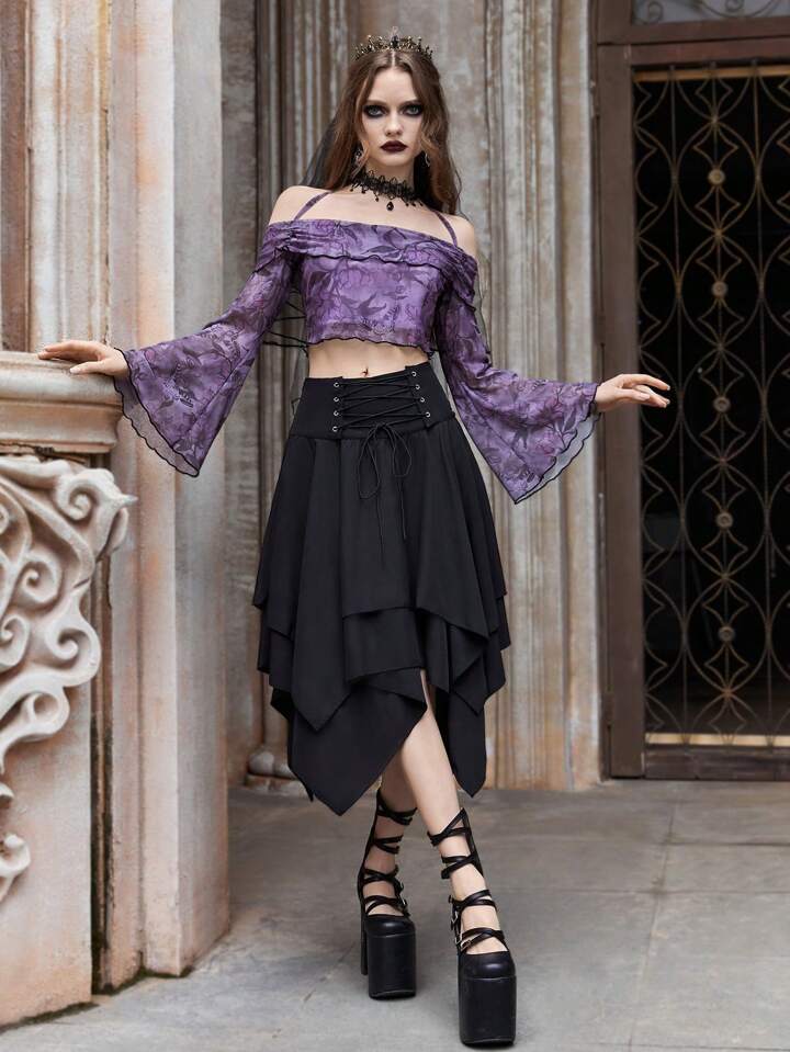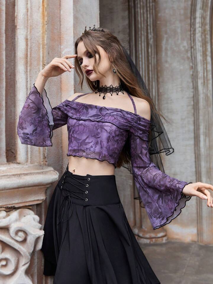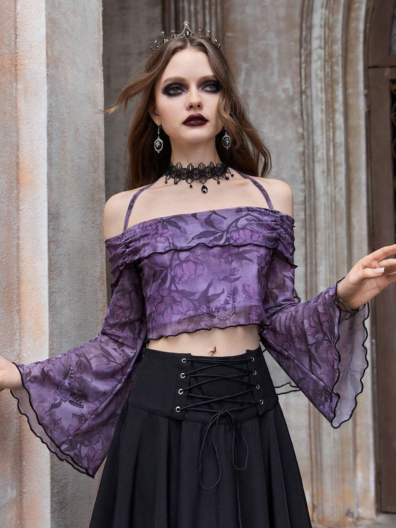 Goth Top Court Imprimé Floral À Épaules Dénudées Manches Évasées