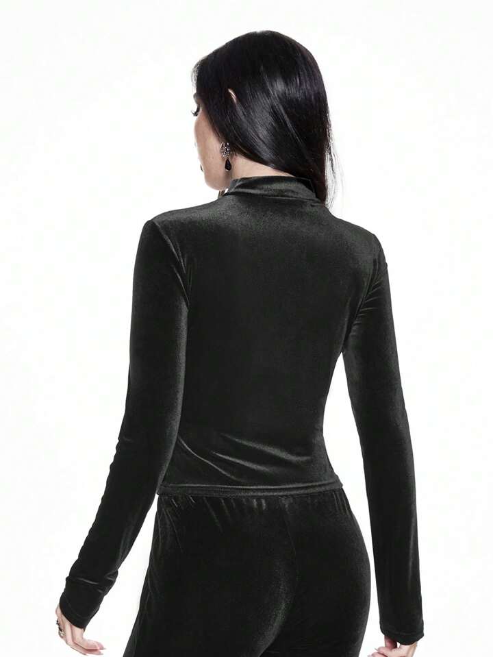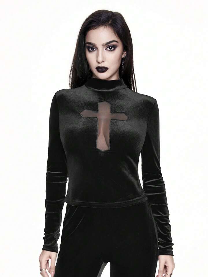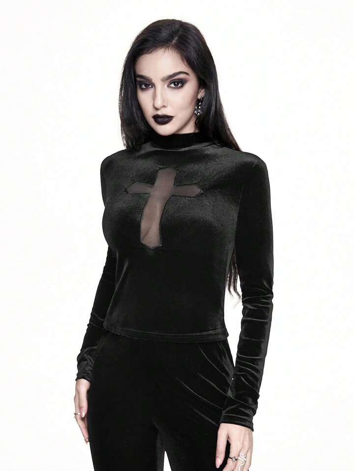 Top à manches longues gothique en velours noir avec une croix ajourée pour femmes, style palace vampire