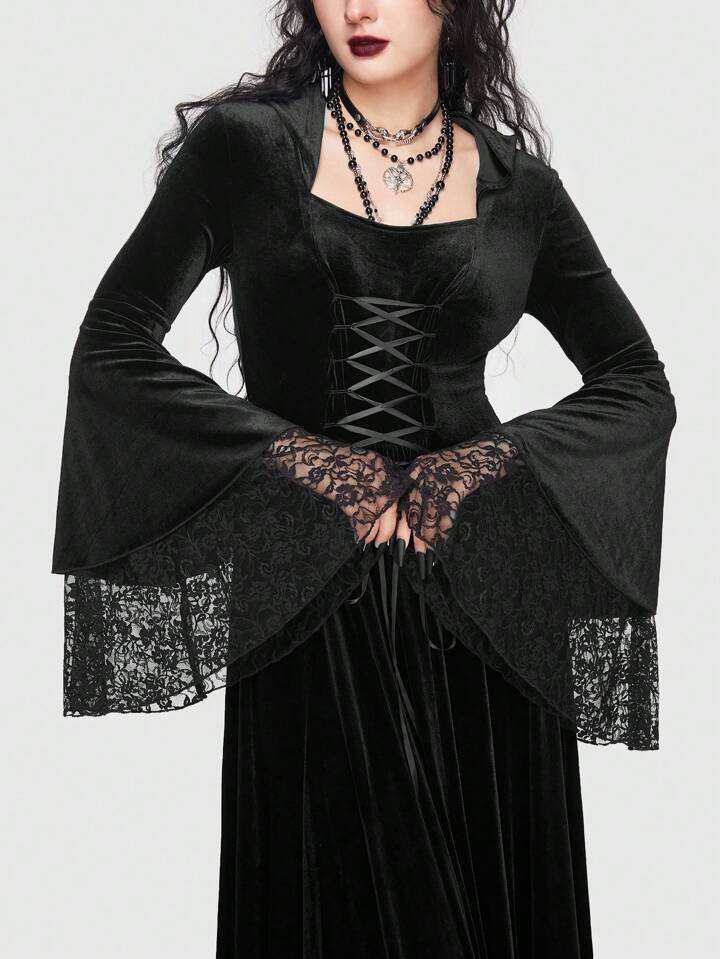 Goth Robe À Lacets En Dentelle Manches Évasées En Velours