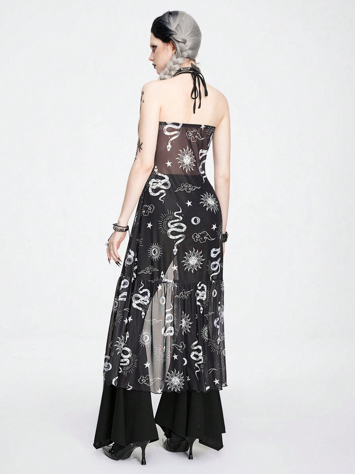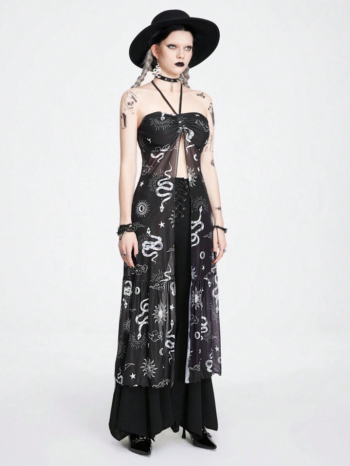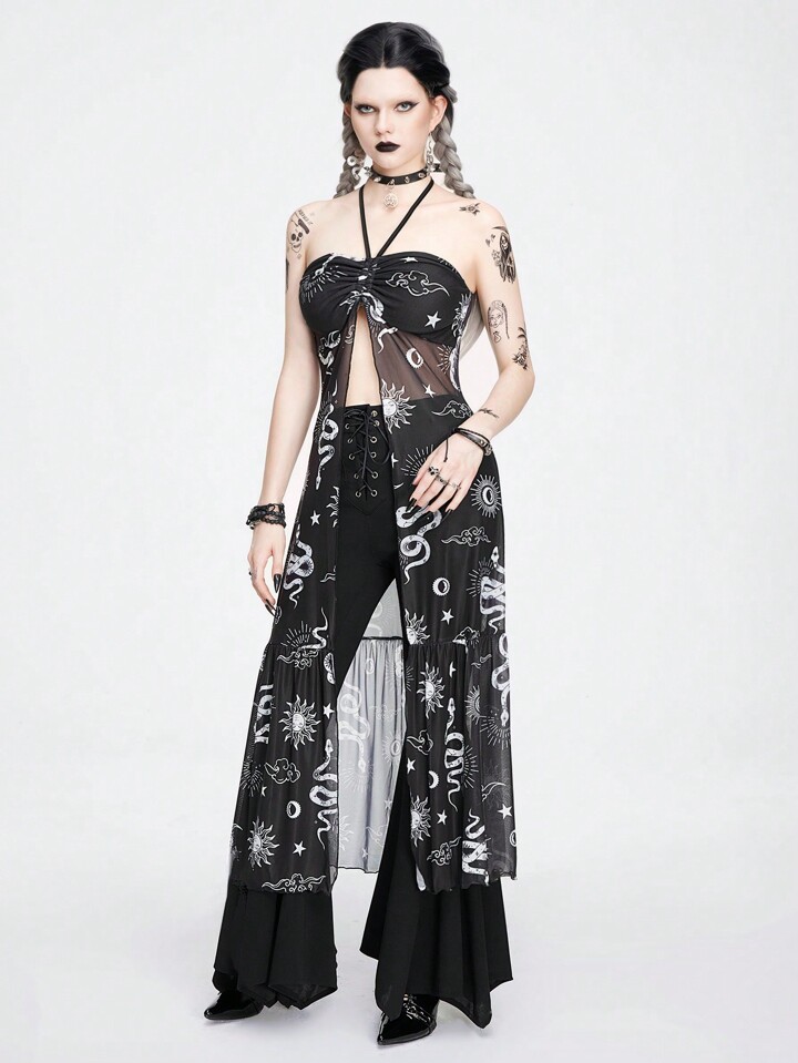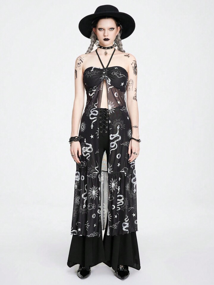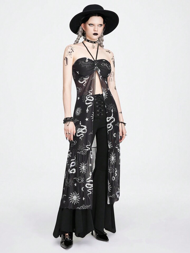 Goth Haut de bandeau décontracté pour dames avec impression en mesh en forme de croissant de lune, étoile et serpent pour les vacances