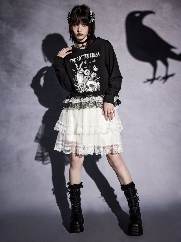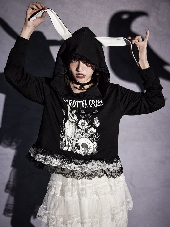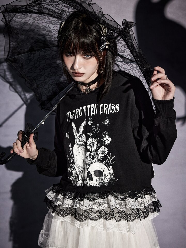 Goth Sweat-shirt à capuche lettre à motif tête de mort en dentelle
