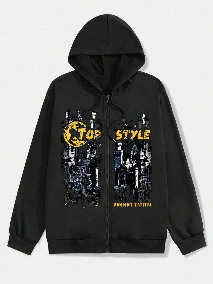 Goth Sweat-shirt À Capuche Avec Cordon De Serrage Zippé Pour Homme Avec Motif De Lettre Graphique
