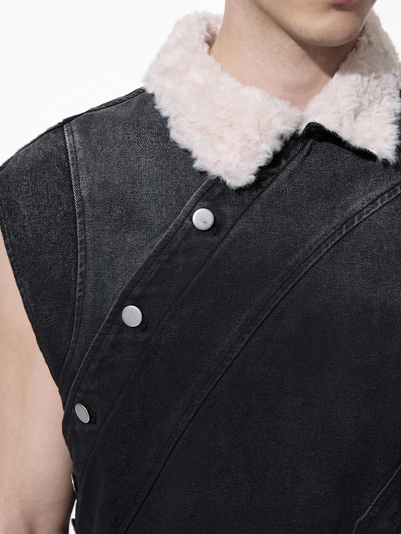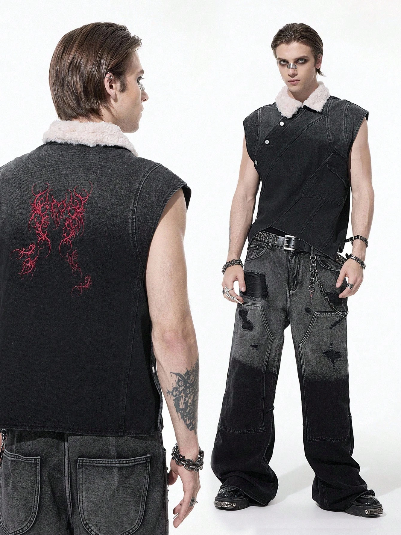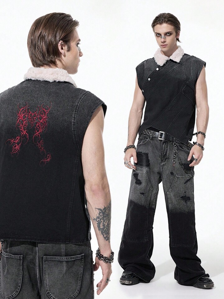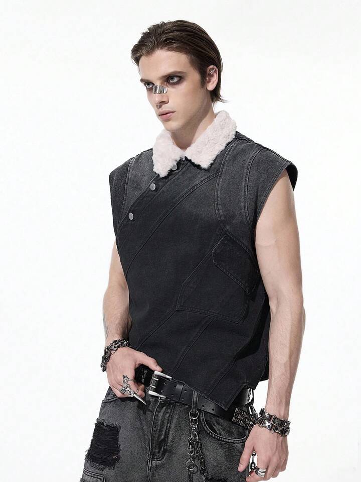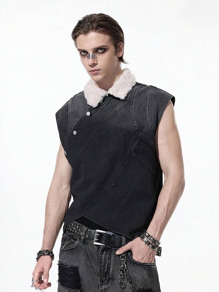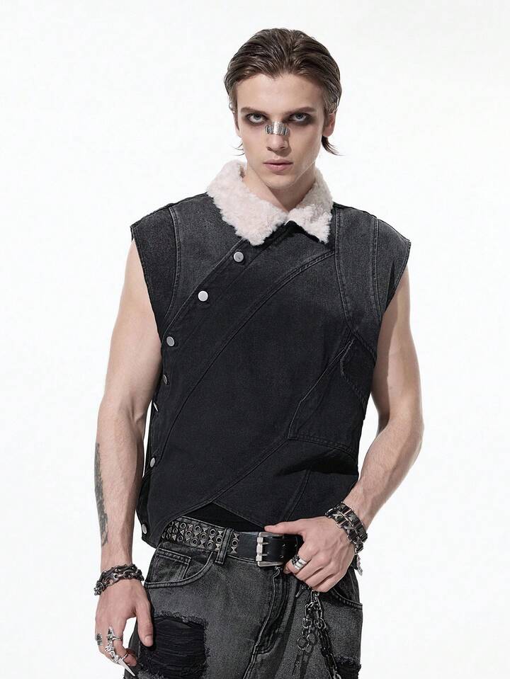 Goth Gilet en denim à col en polaire et patte de boutonnage oblique pour hommes, pour l'automne