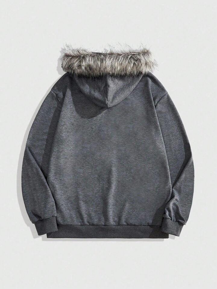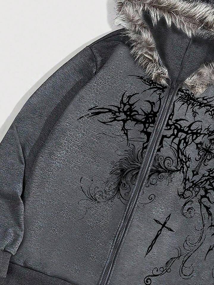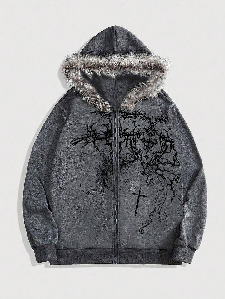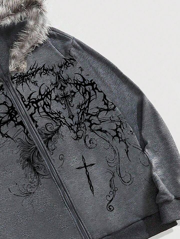Goth sweat-shirt à capuche zippé décontracté pour hommes avec imprimé croix, patchwork et bordure en polaire, automne
