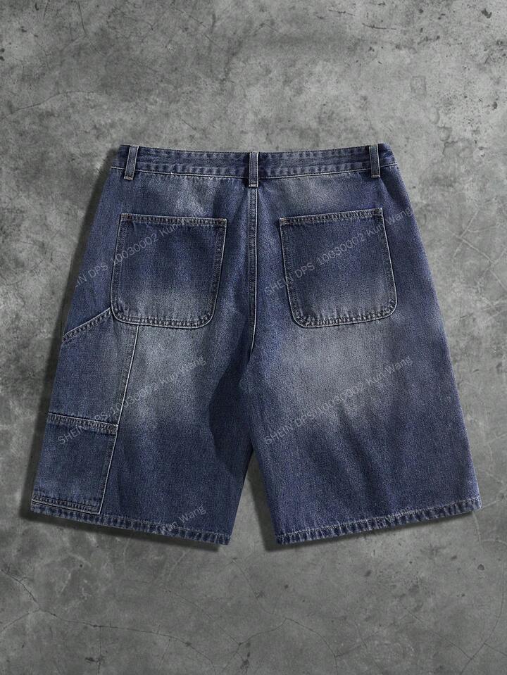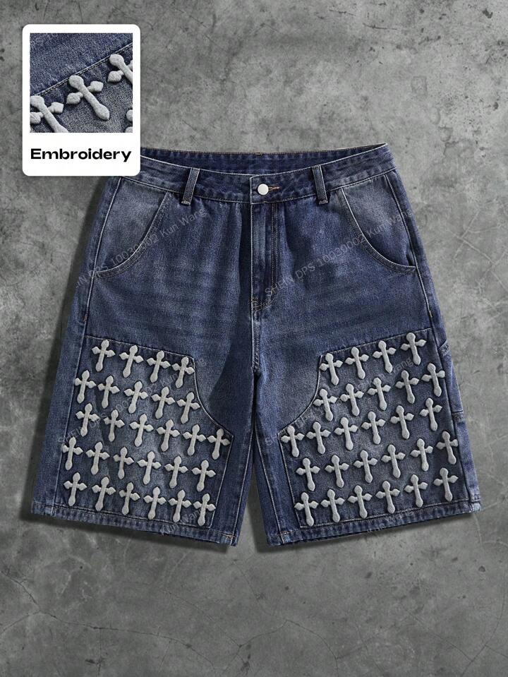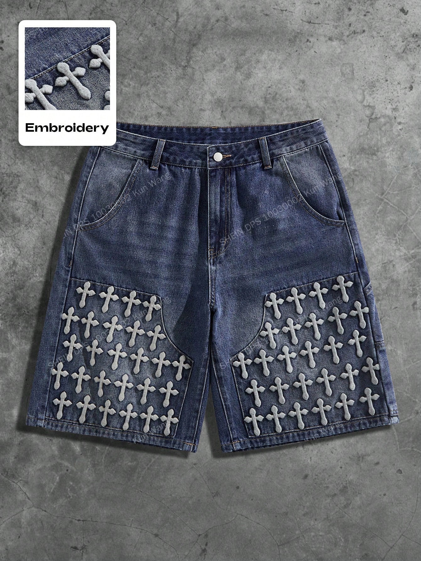 Goth Short en jean décontracté ample avec poche et impression de croix pour hommes