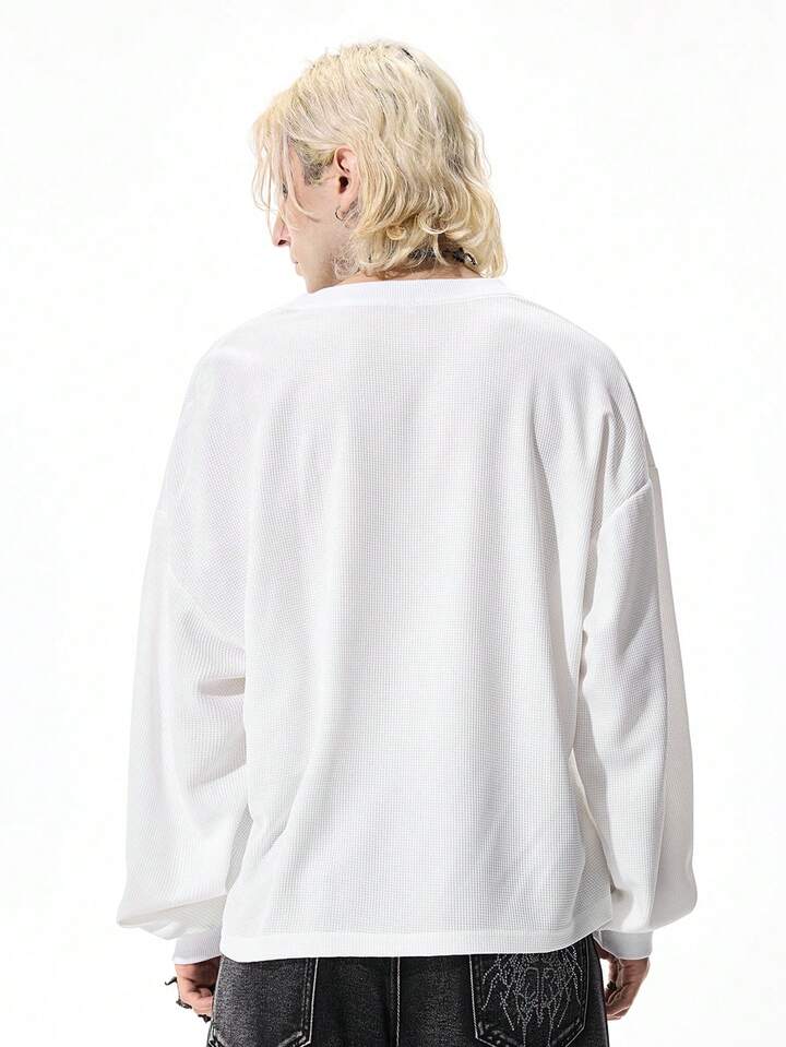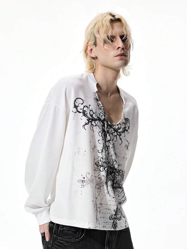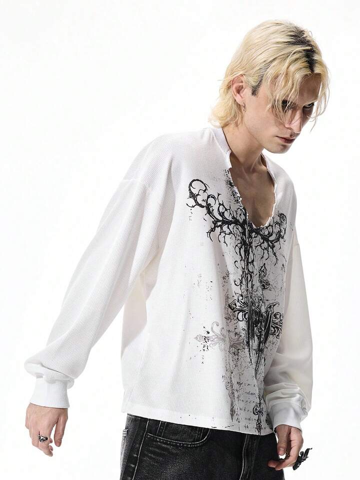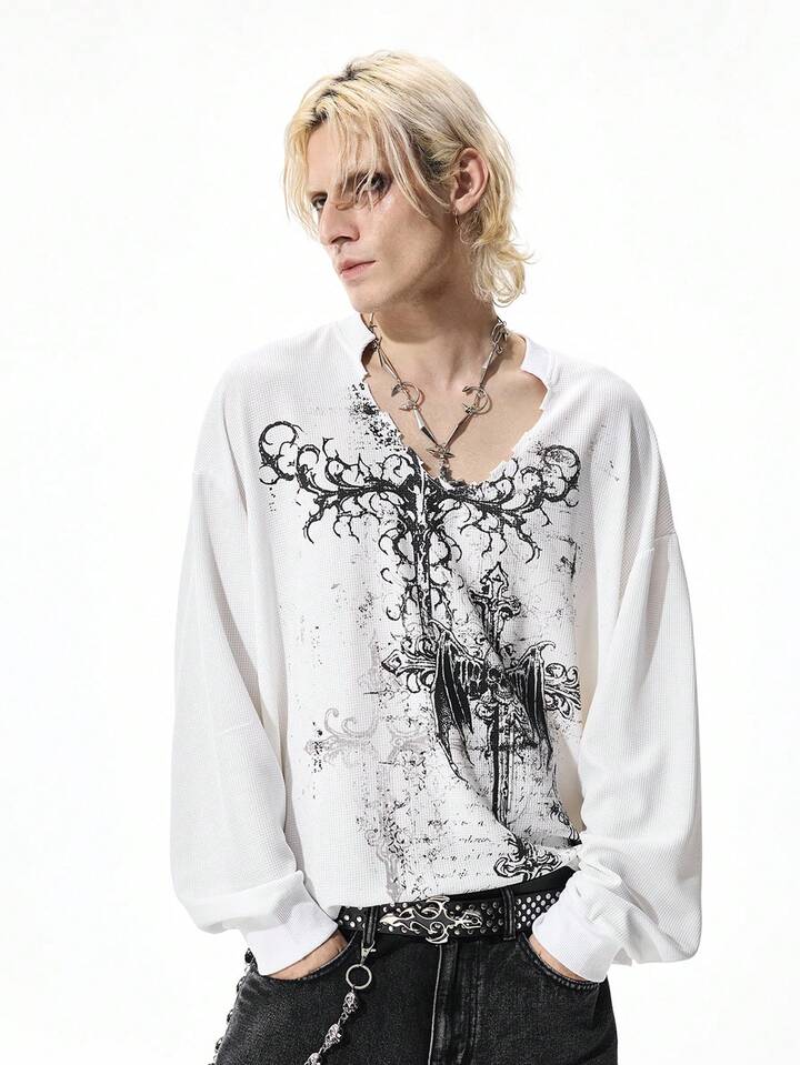 Goth T-shirt décontracté blanc à manches longues et col en V avec imprimé croix pour hommes