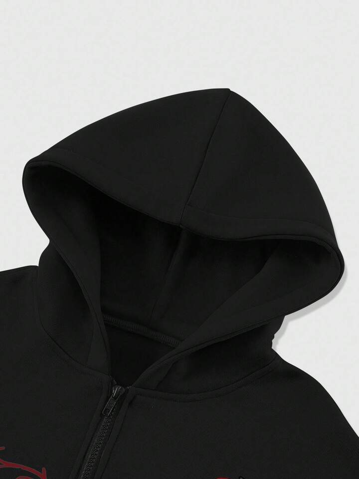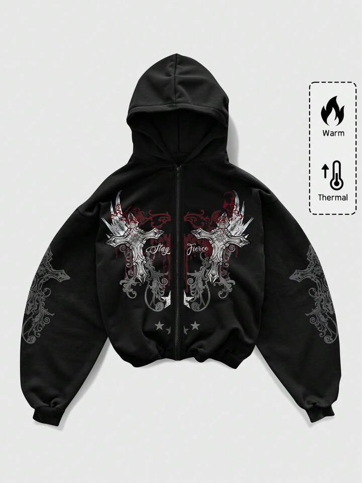 Goth sweat-shirt à capuche zippé avec imprimé croix et lettres, style mode de rue punk casual Y2K, automne/hiver pour hommes
