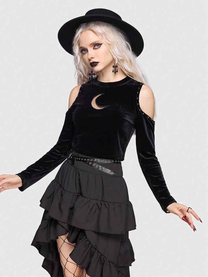 Goth T-shirt Imprimé Lune À Épaules Dénudées En Velours
