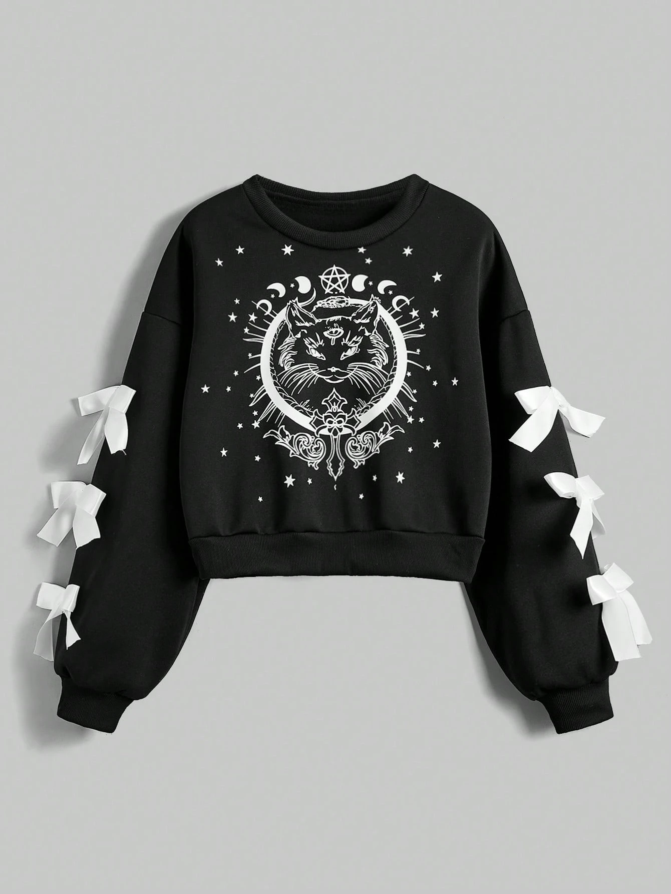 Goth sweat-shirt à capuche polaire avec impression de chat mystérieux et décoration de nœud