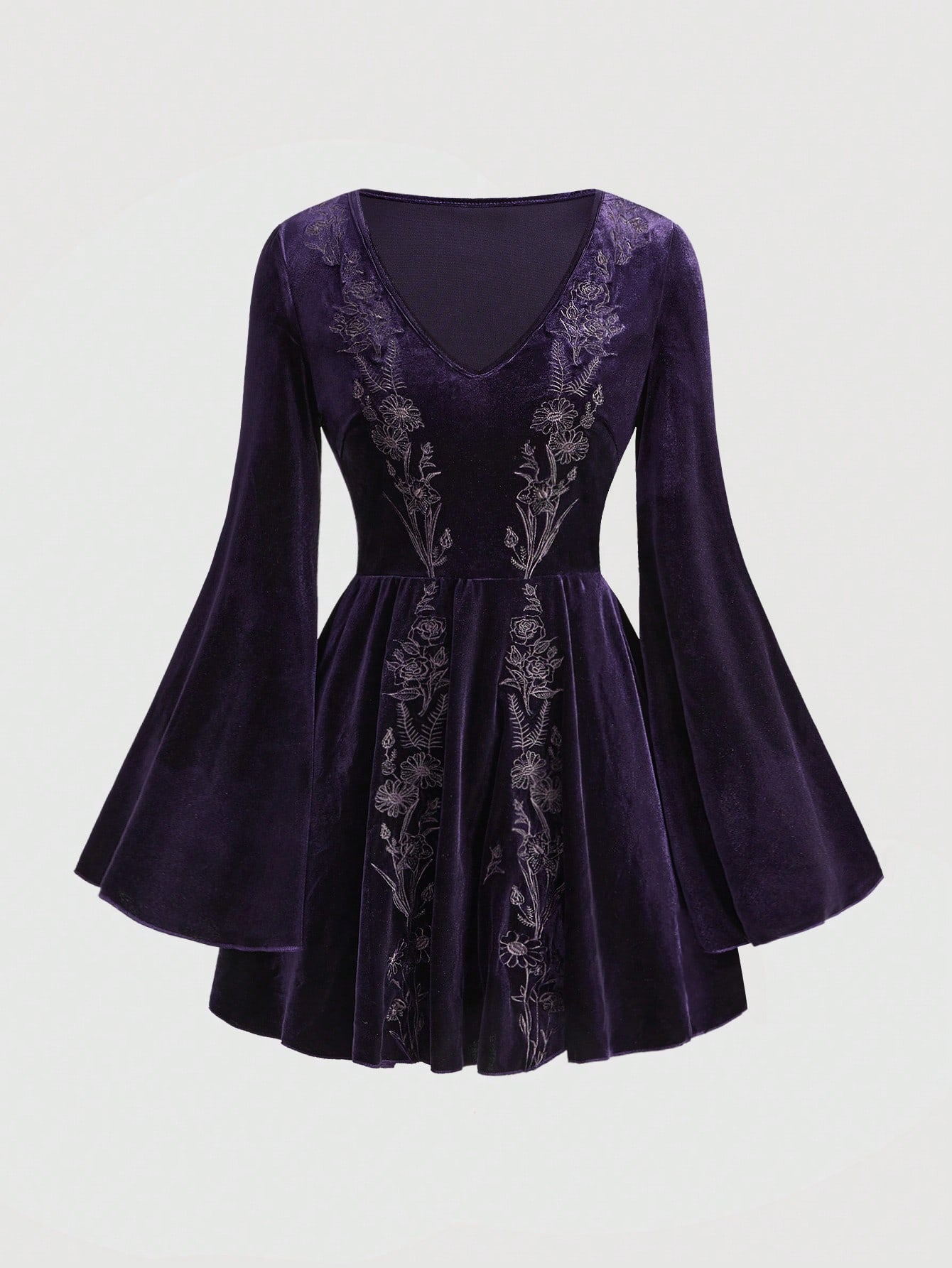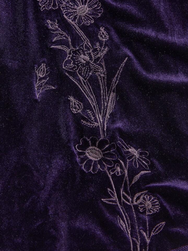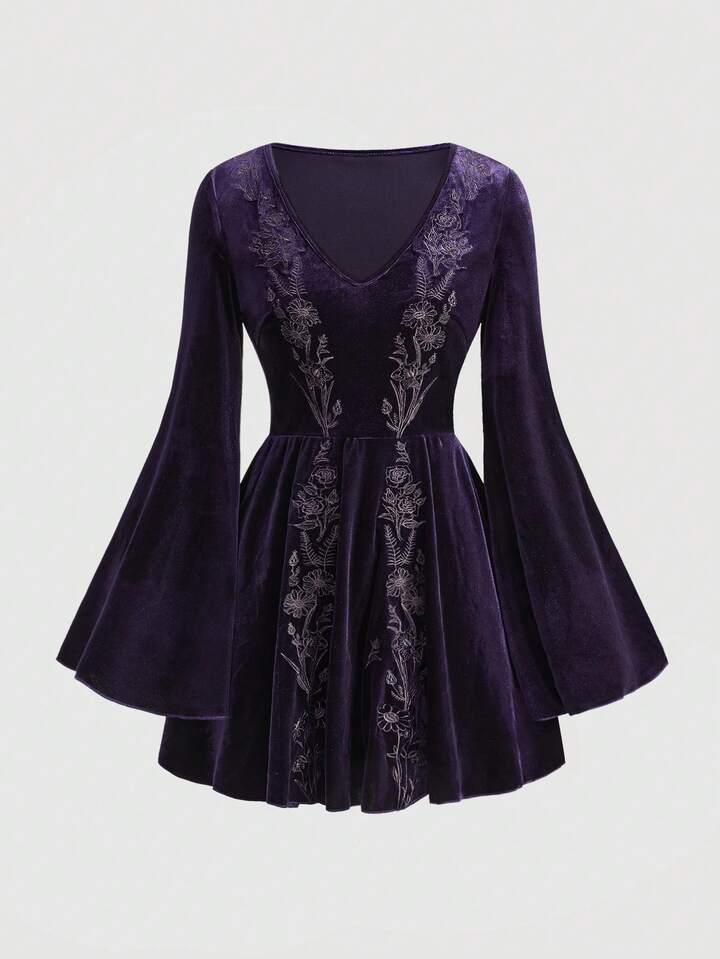 Goth Robe mini en velours à manches évasées violette foncée avec broderie de plantes d'herbes de sorcière mystérieuses