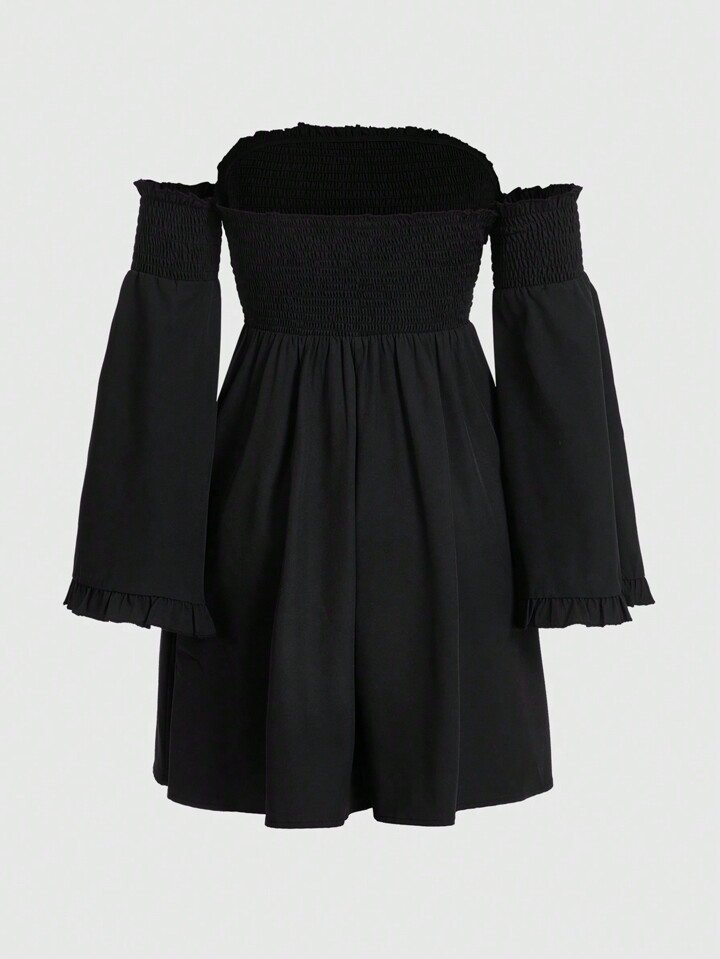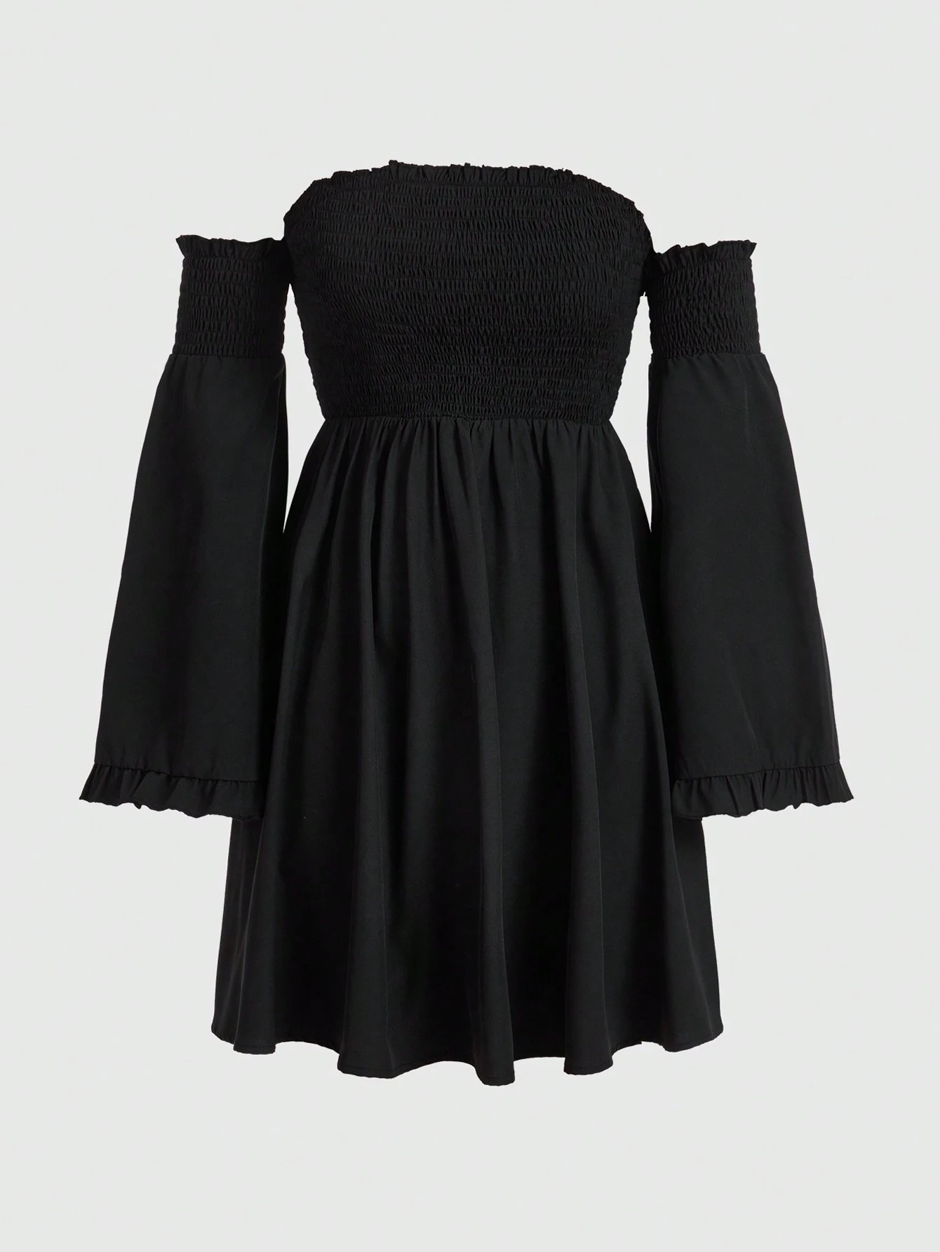Goth Robe Froncée Col Bardot À Manche Évasée