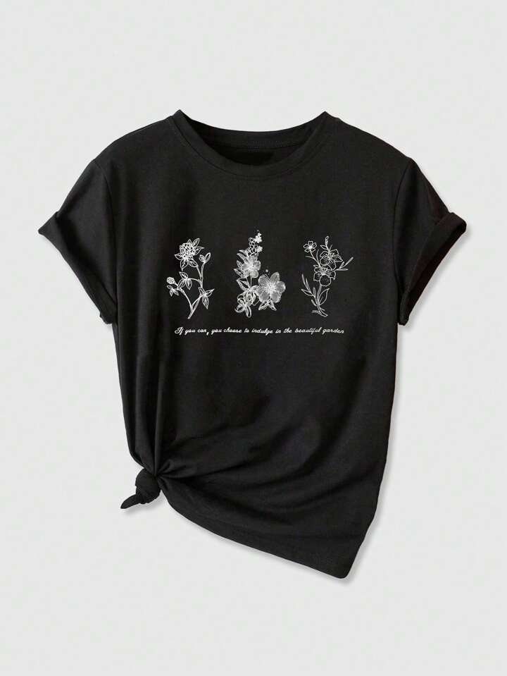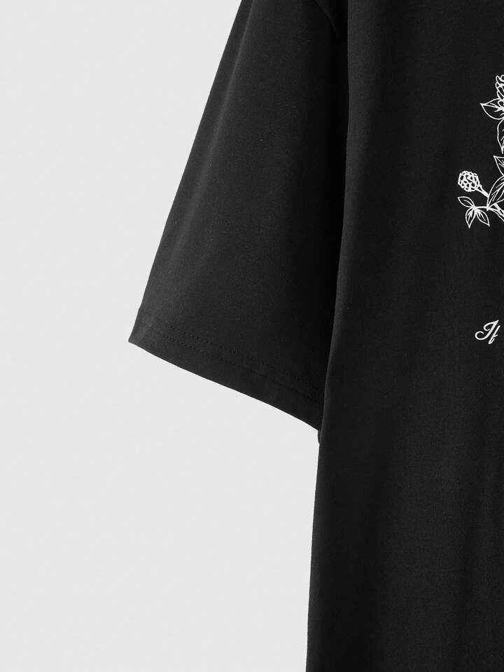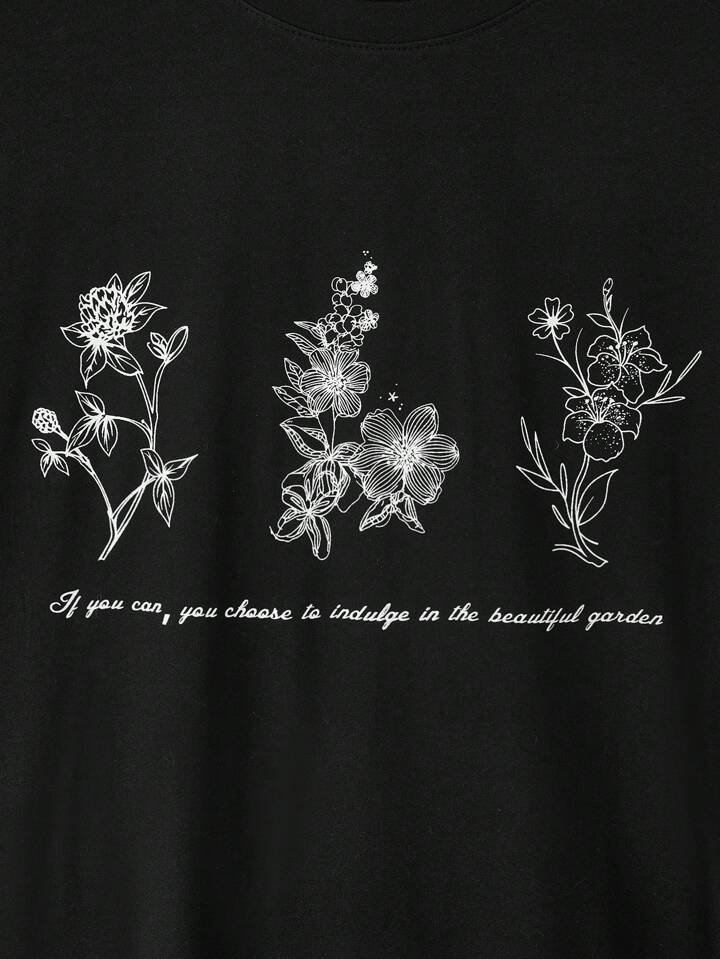 T-shirt noir à col rond ample imprimé de plantes gothiques pour femmes