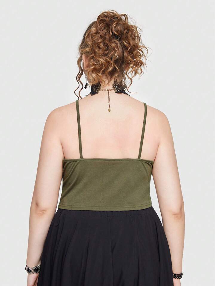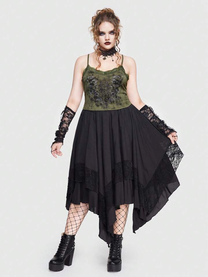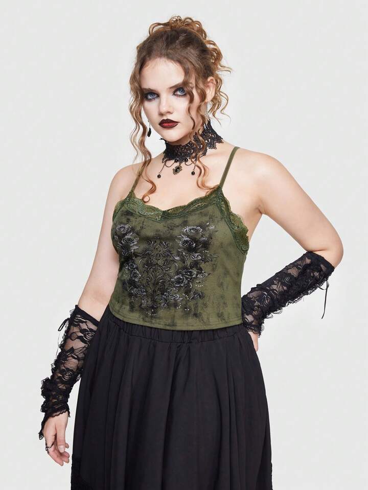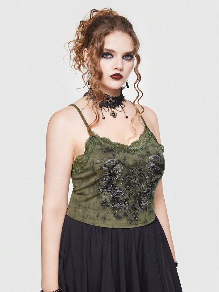 Goth Plus Top À Fines Brides Imprimé Floral Ourlet En Dentelle