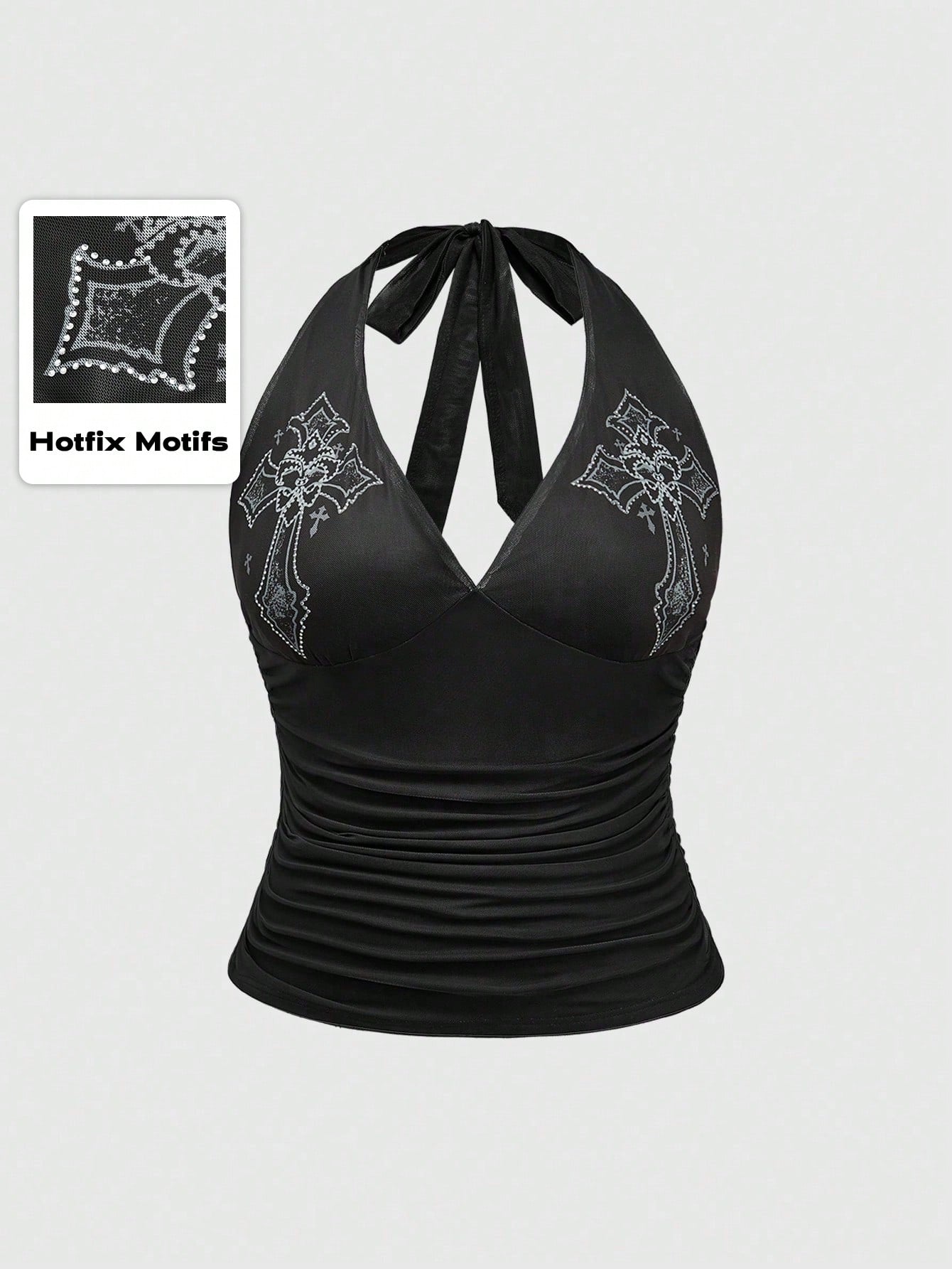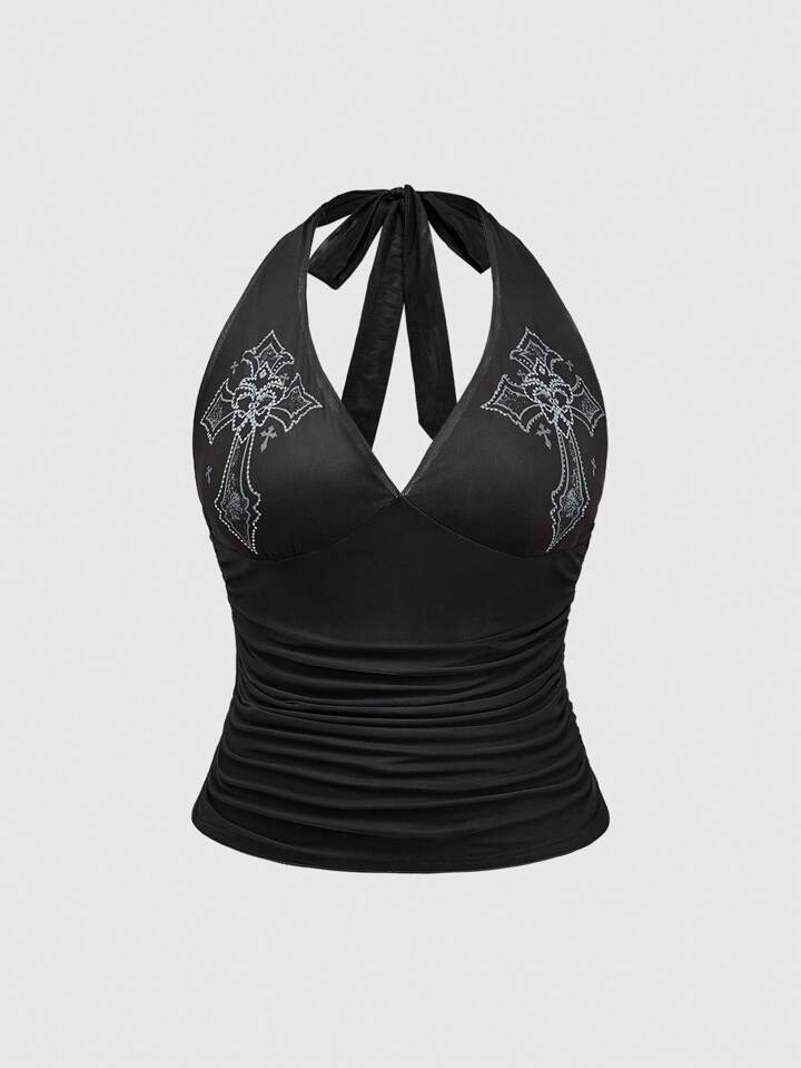 Goth Débardeur col montant grande taille avec côtés froncés et cristaux croisés en maille