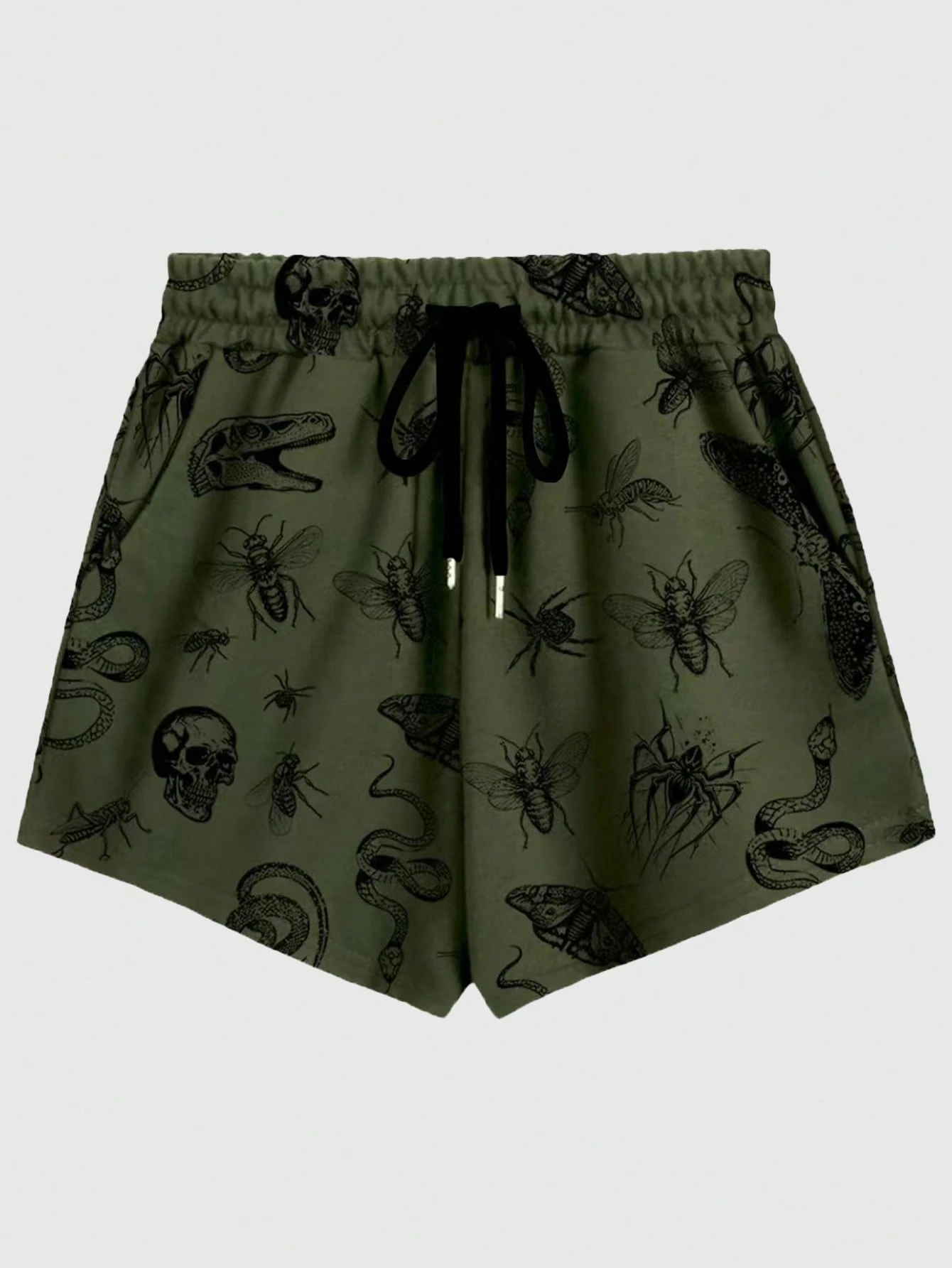 Goth Short décontracté à taille cordon de serrage avec imprimé plante et insecte, grande taille. Convient pour la maison et l'extérieur