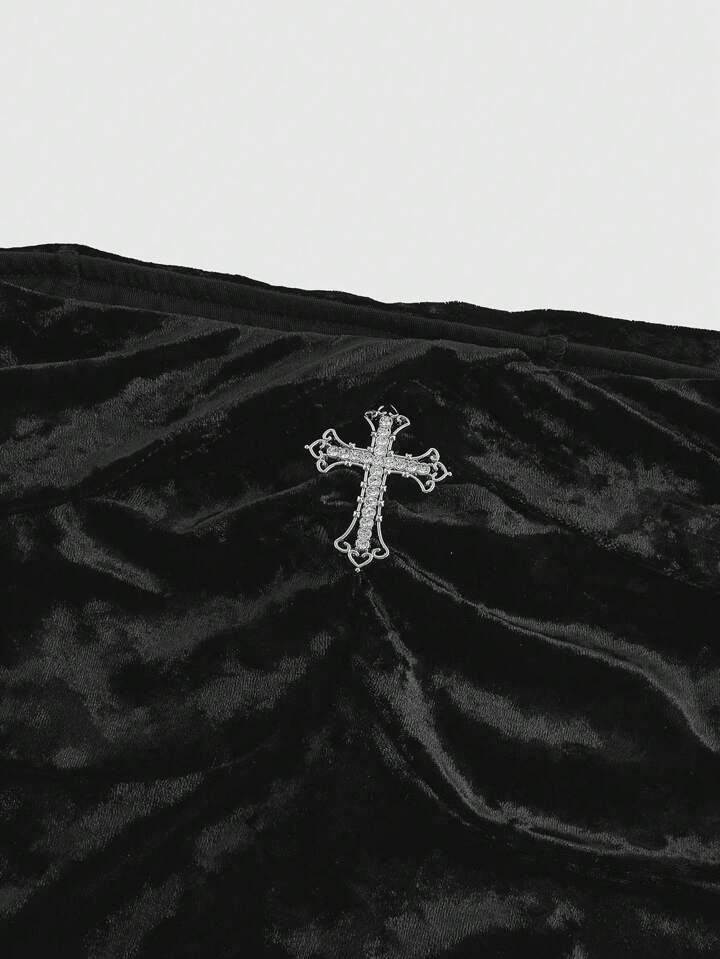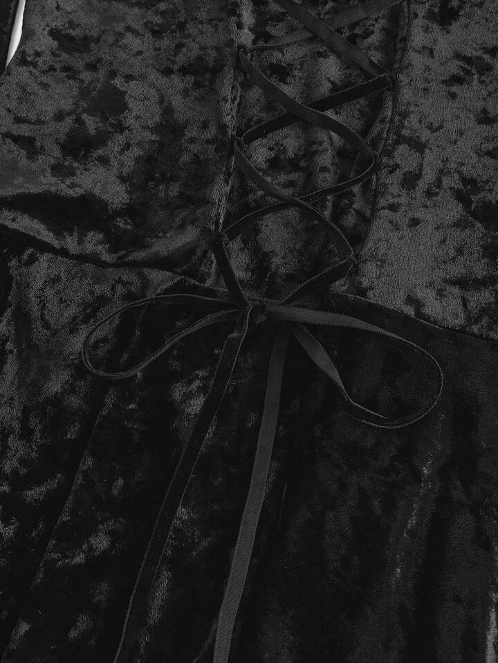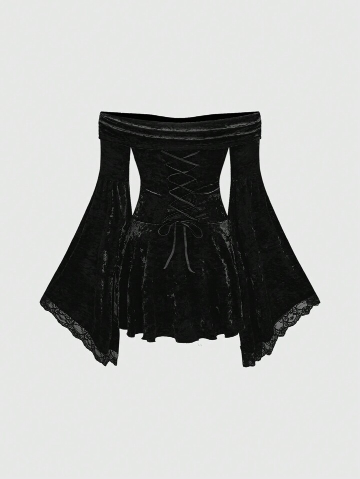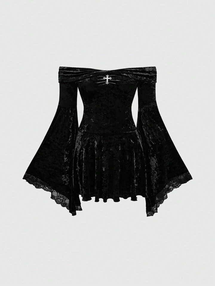 Goth Robe vintage romantique avec épaules dénudées, pendentif croisé, drapée à l'avant, manches évasées, contraste de dentelle et velours, pour le Nouvel An, grandes tailles
