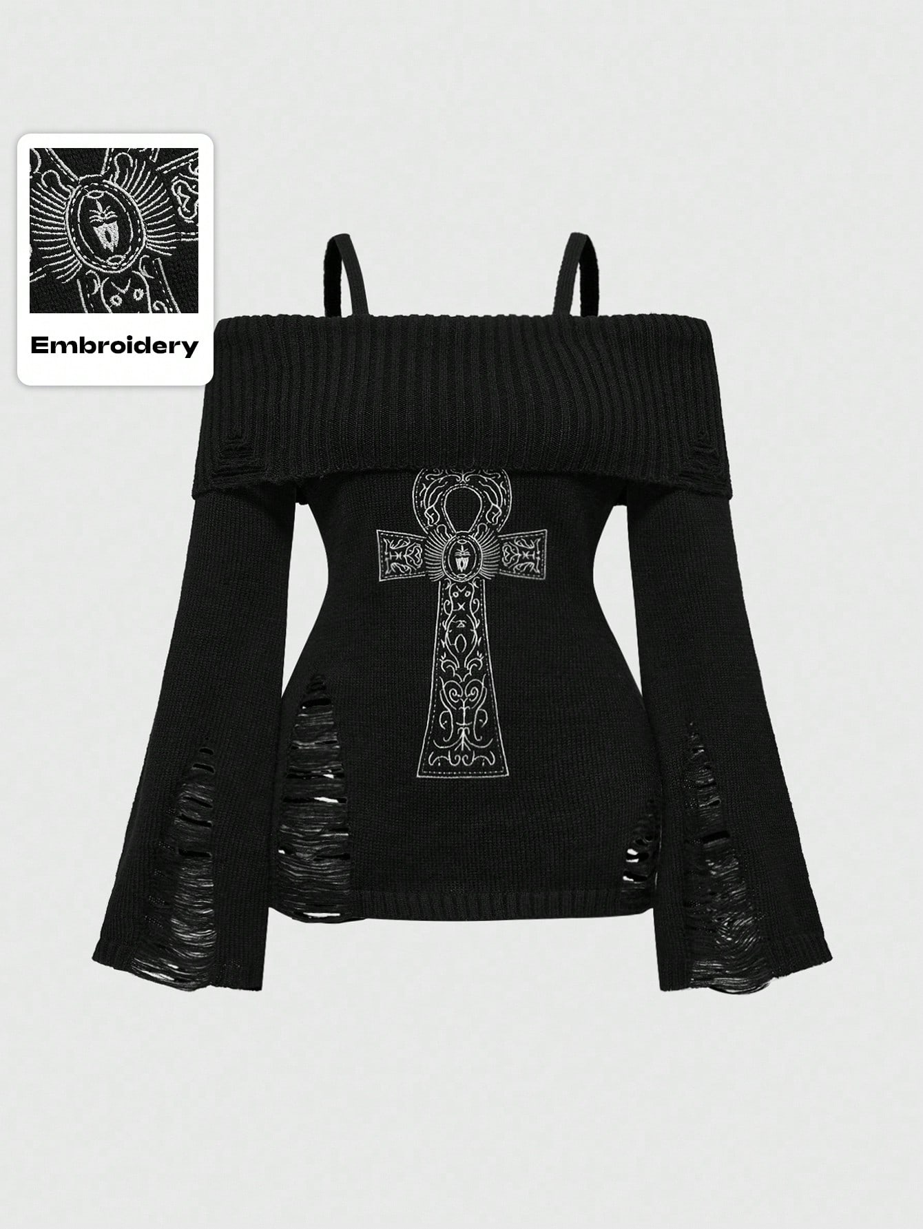 Goth Femmes grande taille Chandail ajusté à épaules dénudées avec broderie croix ankh punk déchirée