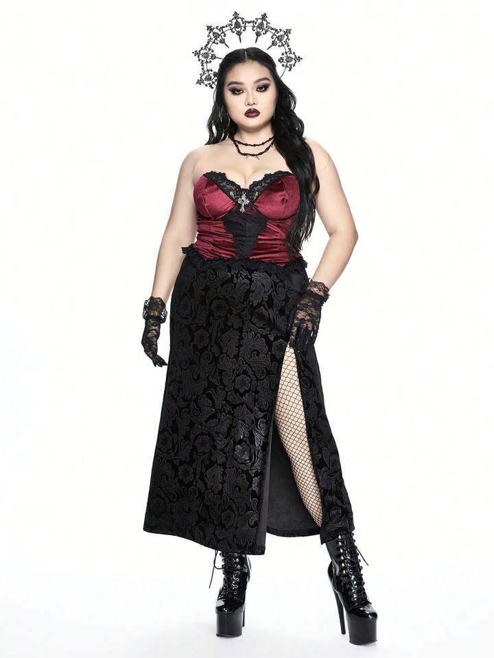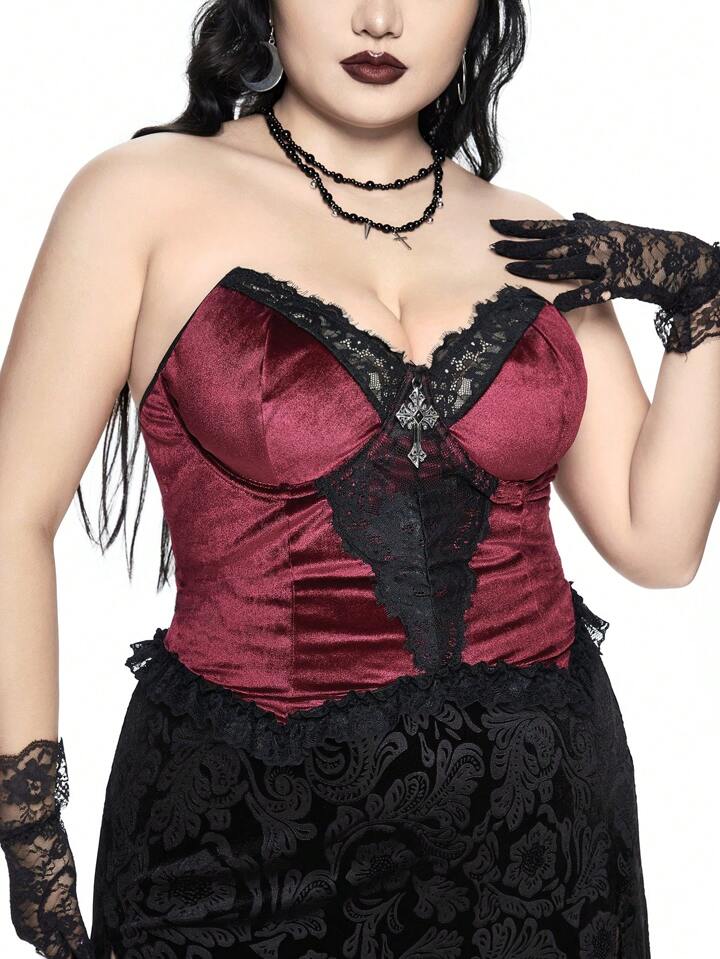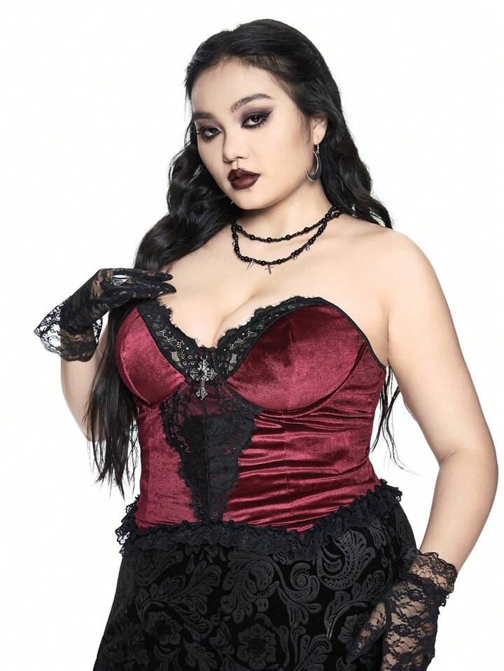 Goth Top bandeau avec patchwork en dentelle et velours, grande taille pour femmes