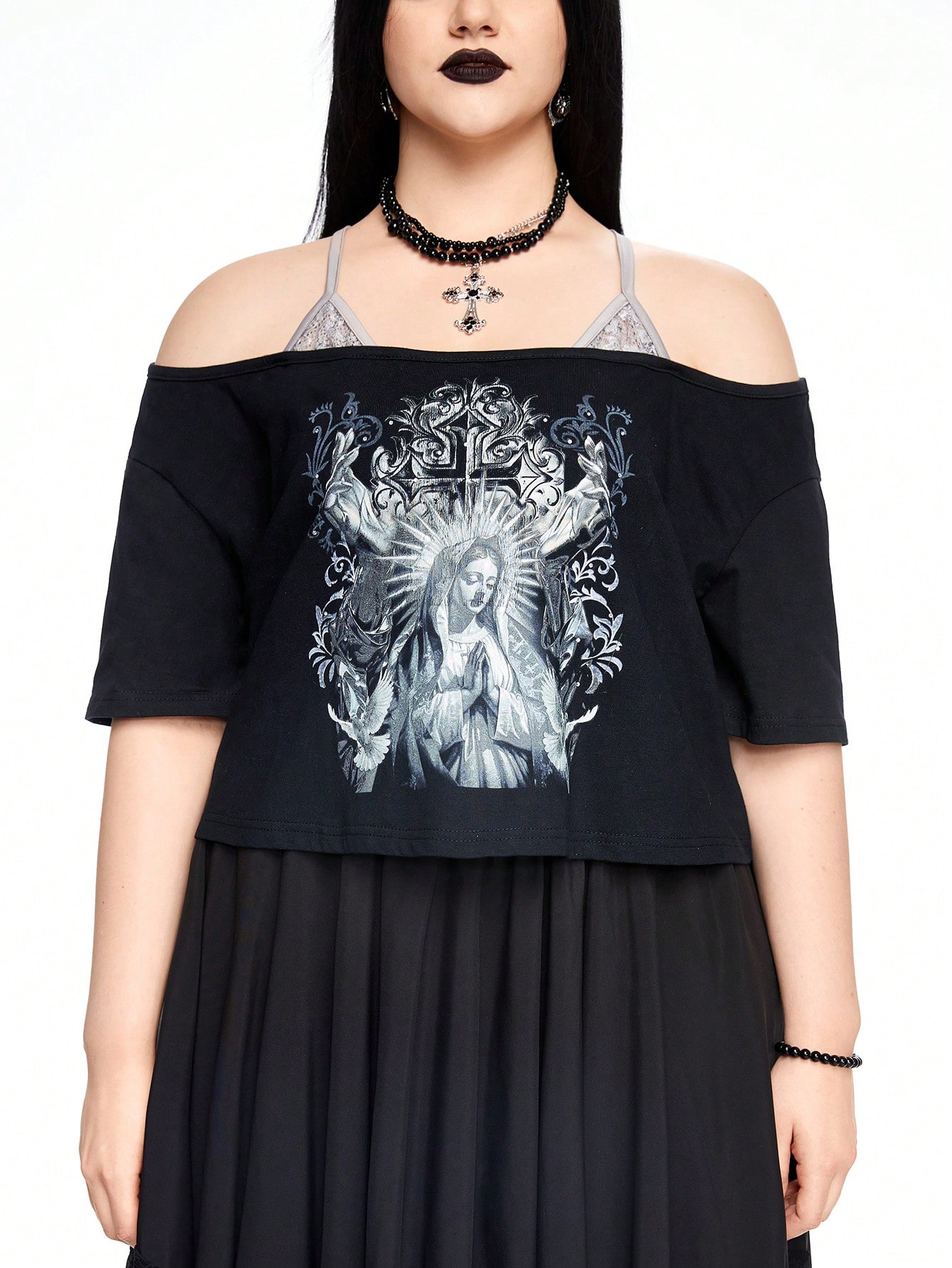 Goth T-shirt quotidien simple à épaules ouvertes imprimé pour femmes grandes tailles
