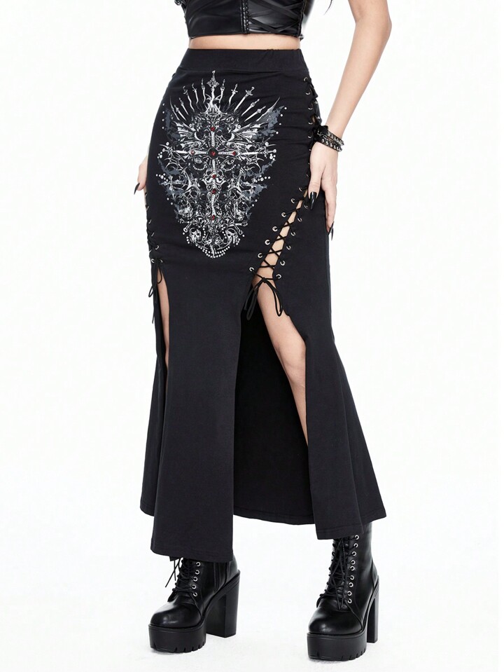 Goth Jupe moulante sexy pour femmes avec laçage, imprimé croix, ornements de strass et fente haute