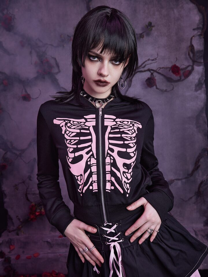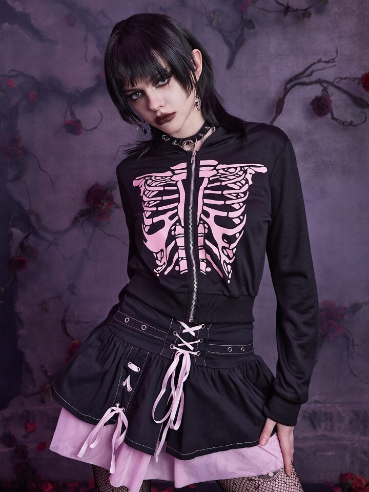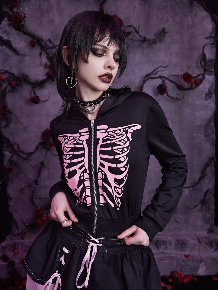 Goth Sweat-shirt à capuche zippé à imprimé squelette