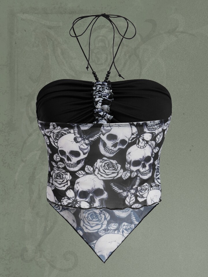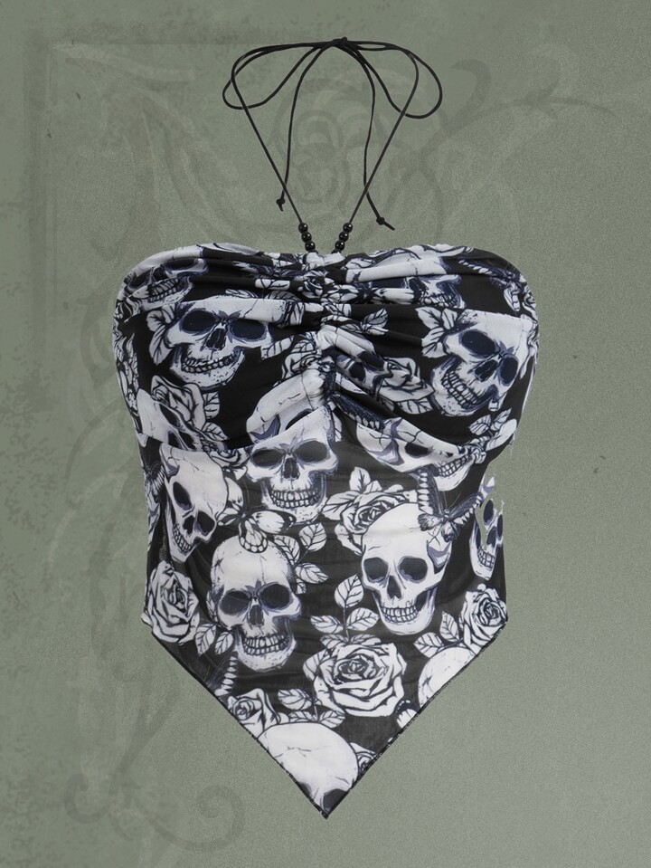 Goth Top Ras-Du-Cou Imprimé Fleuri Et Squelette À Ourlet Bandana