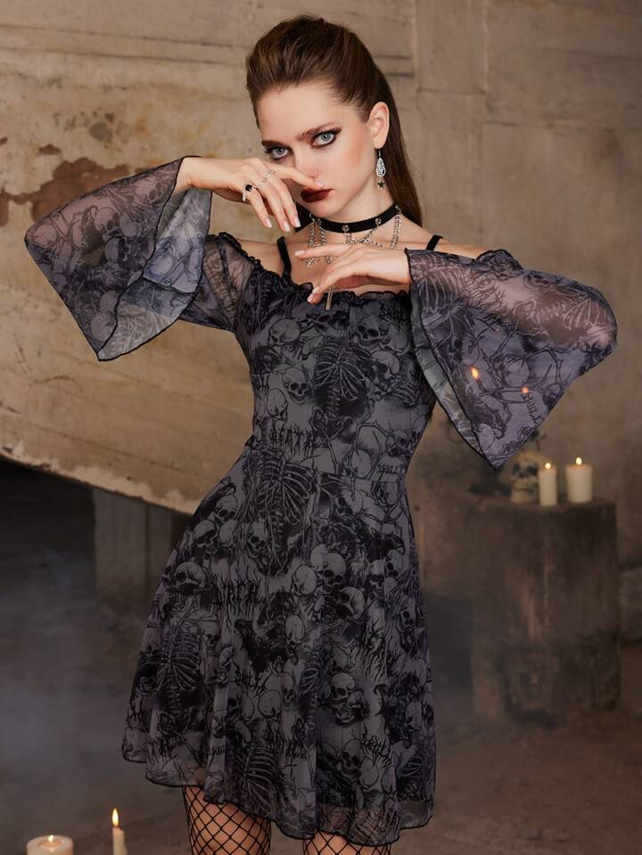 Goth Robe à imprimé tête de mort à épaules dénudées