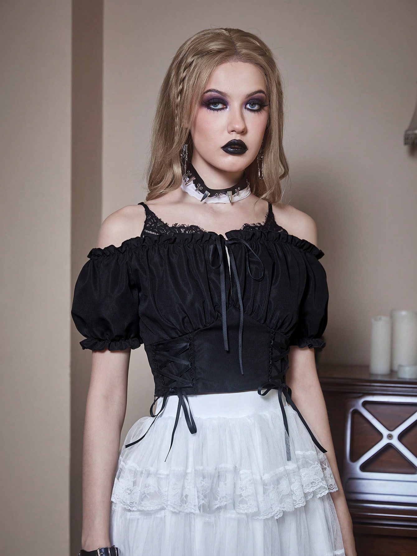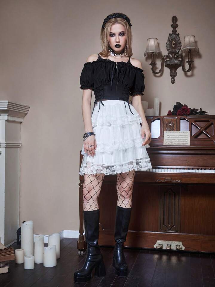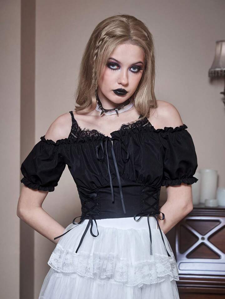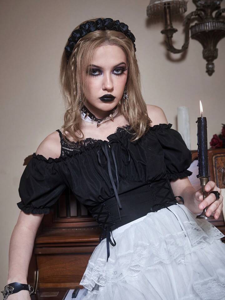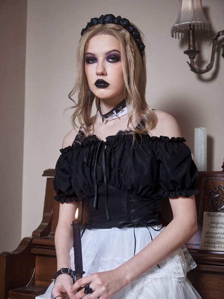 Goth Blouse unicolore à lacets à plis à épaules dénudées
