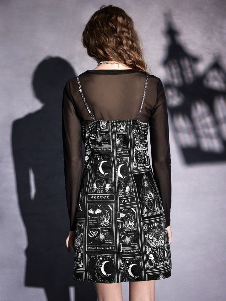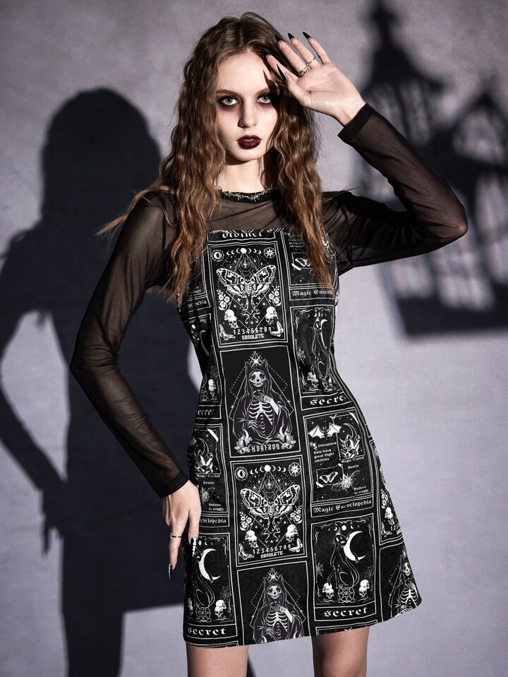 Goth Top unicolore en tulle & Robe à fines brides lettre à imprimé tête de mort