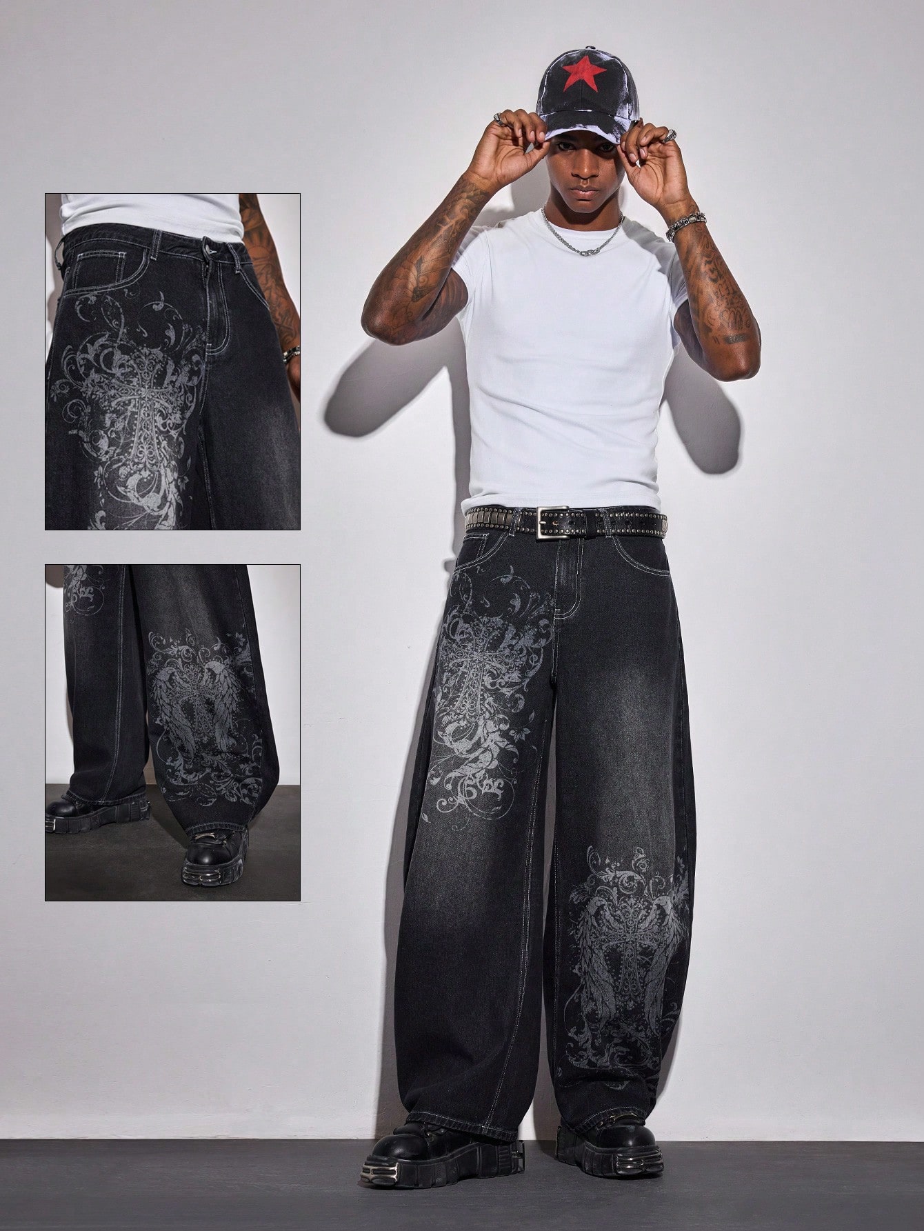 Goth Jeans en denim vintage délavé avec poche graphique croix et aile, style casual pour hommes