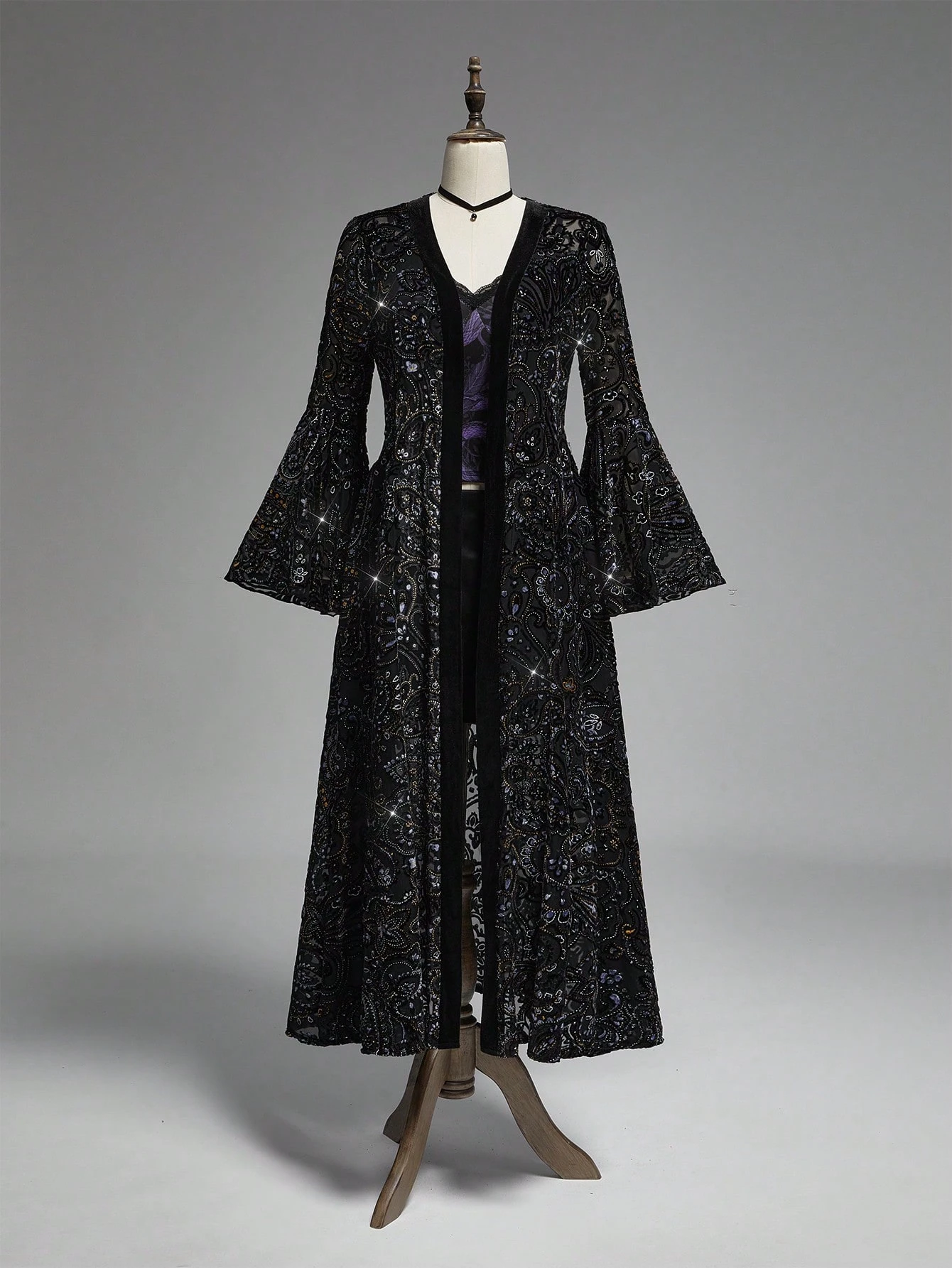 Goth Robe longue élégante à manches longues, dos nu, couleur unie avec broderie pour femmes