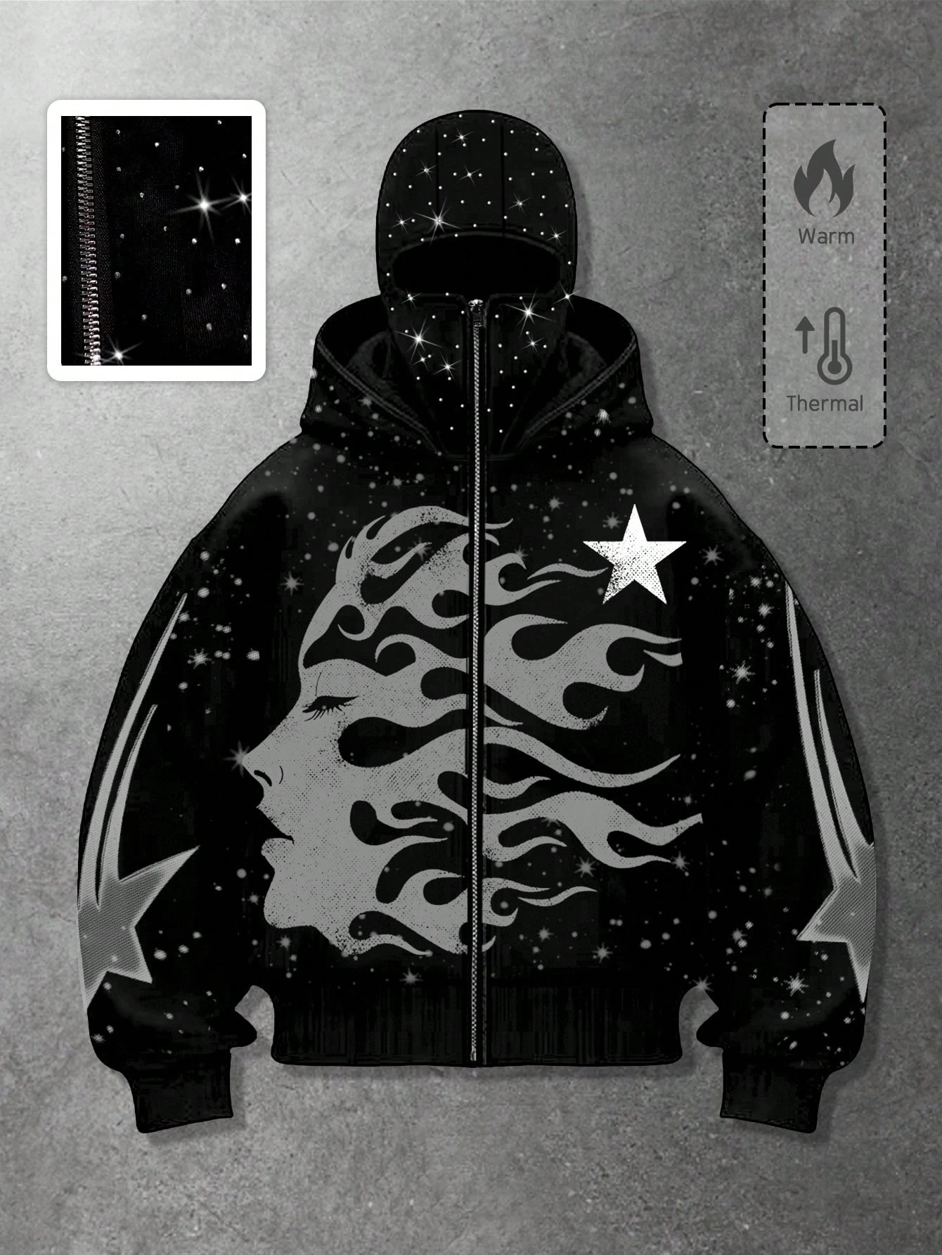 Goth Sweat-shirt-shirt zippé à capuche sombre et élégant avec ornements de strass pour hommes