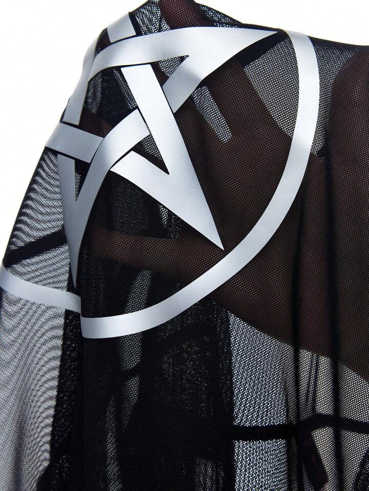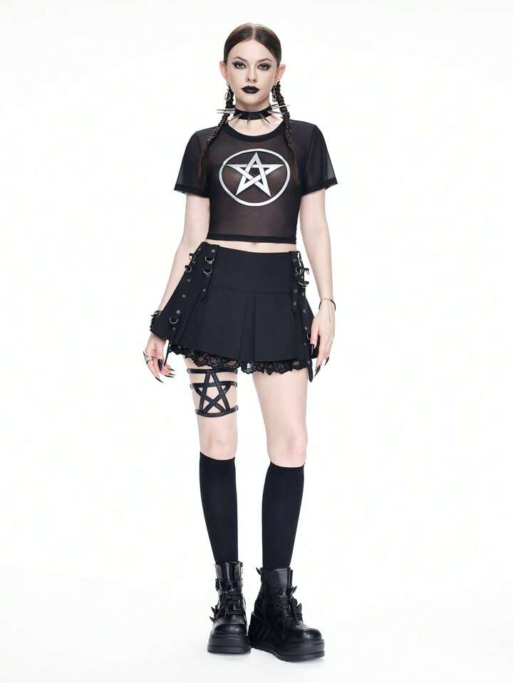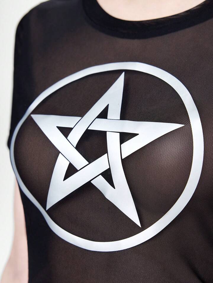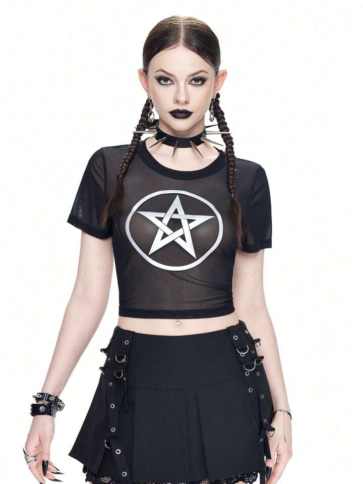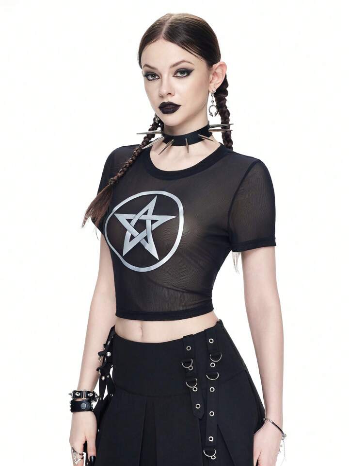 Goth T-shirt transparent à manches courtes sexy avec motif maille noire imprimé