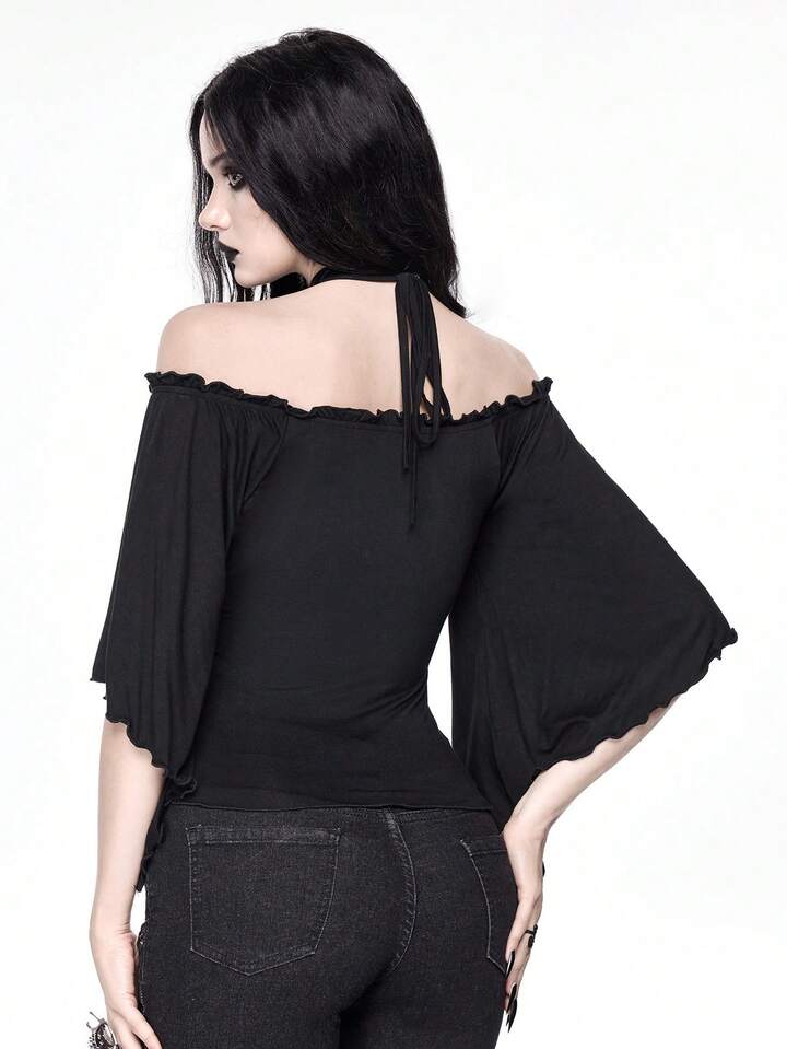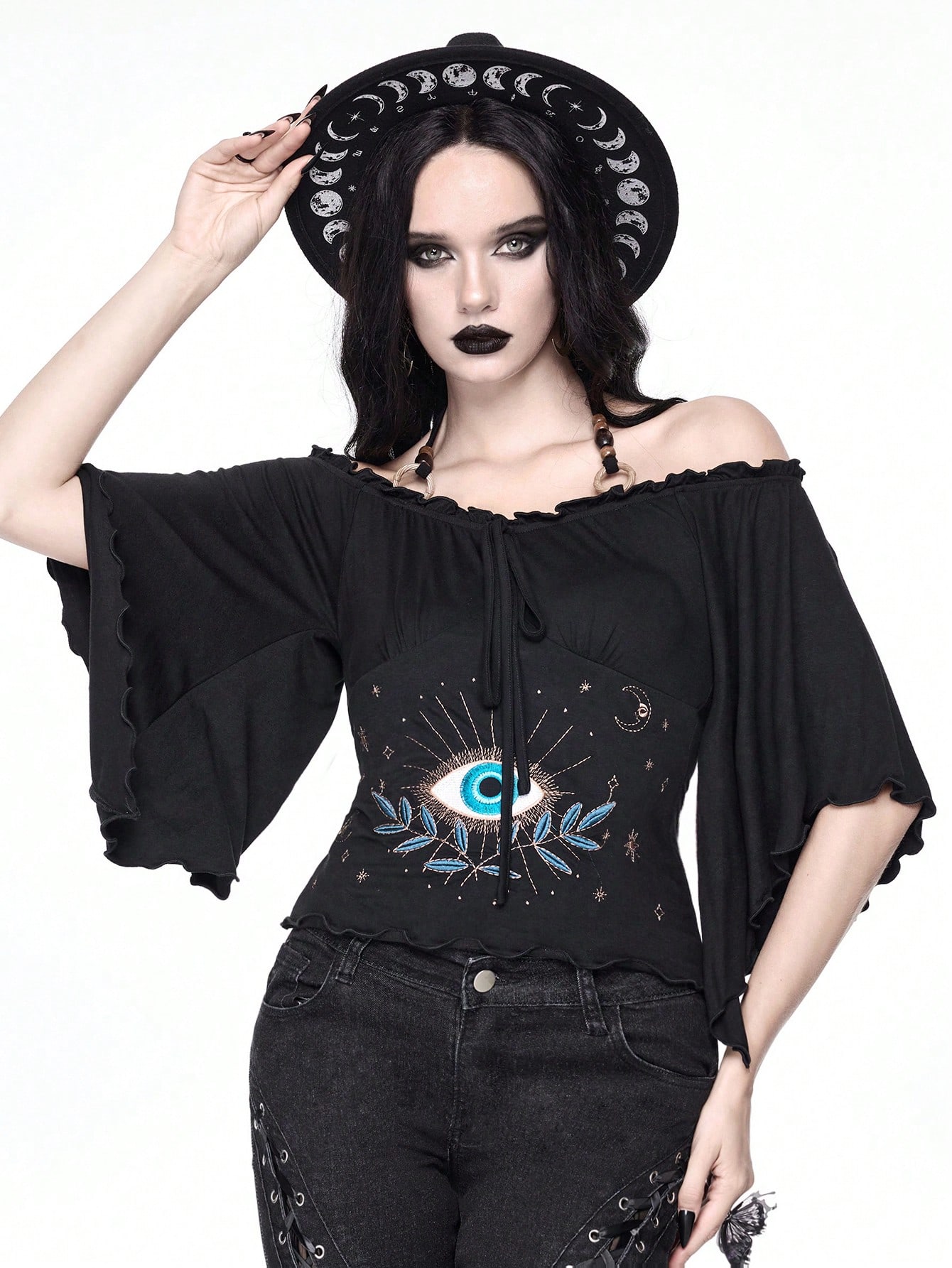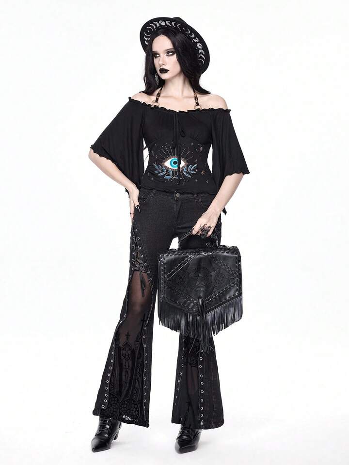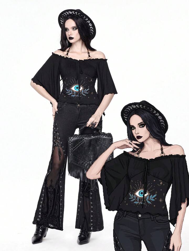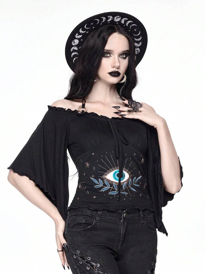 Goth Vintage Loose Off Shoulder Wood Bead Decor Eye Embroidery Batwing Sleeve Women T-Shirt