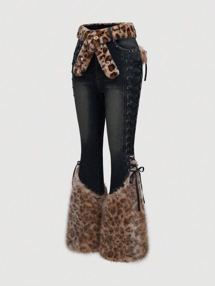 Goth Jeans en denim à imprimé léopard en patchwork de fausse fourrure de couleur rétro vintage