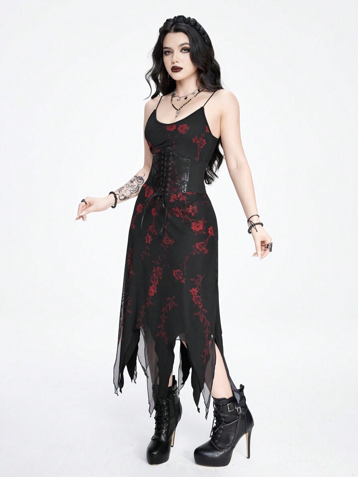 Goth Robe moulante asymétrique avec imprimé rose vintage et bretelles de cache-cœur pour femmes