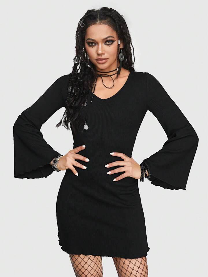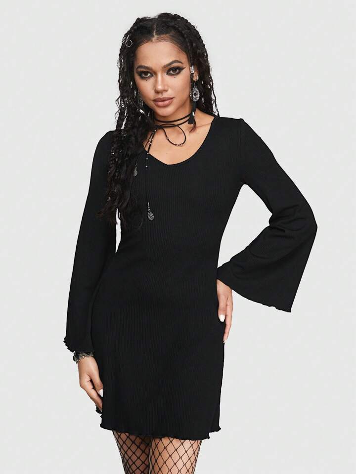 Goth Robe Dos Nu À Col En V Et Manches Évasées Pour Femmes