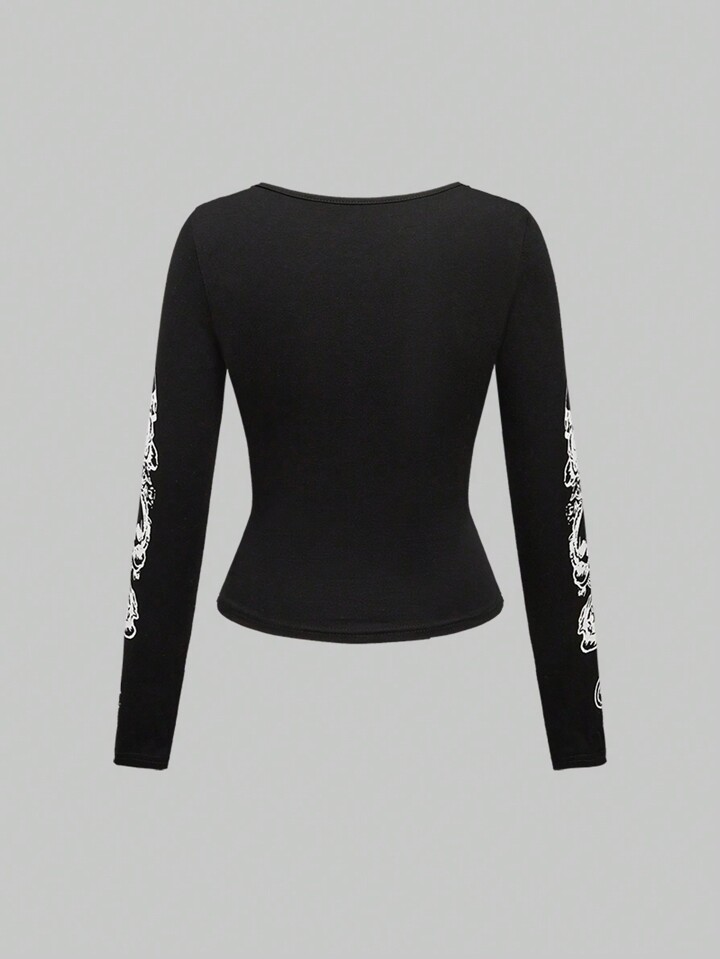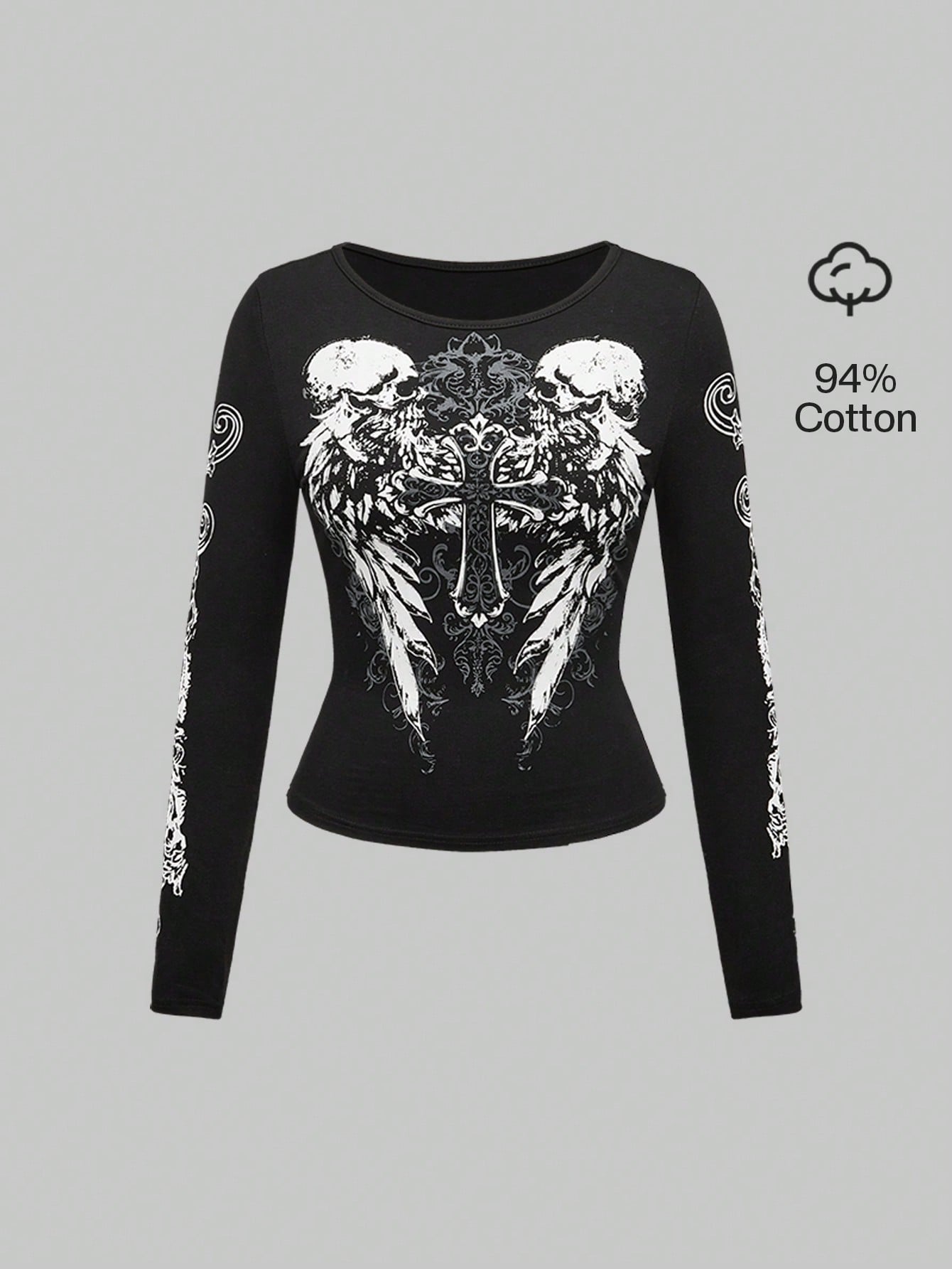 Goth T-shirt à manches longues col rond avec imprimé crâne asymétrique et aile pour femmes, style délavé pour l'automne