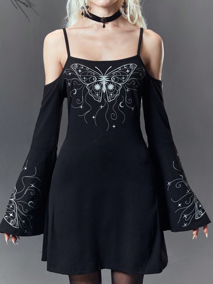 Goth Robe À Manches Évasées Et Épaules Dénudées Pour Femmes Avec Imprimé Papillon
