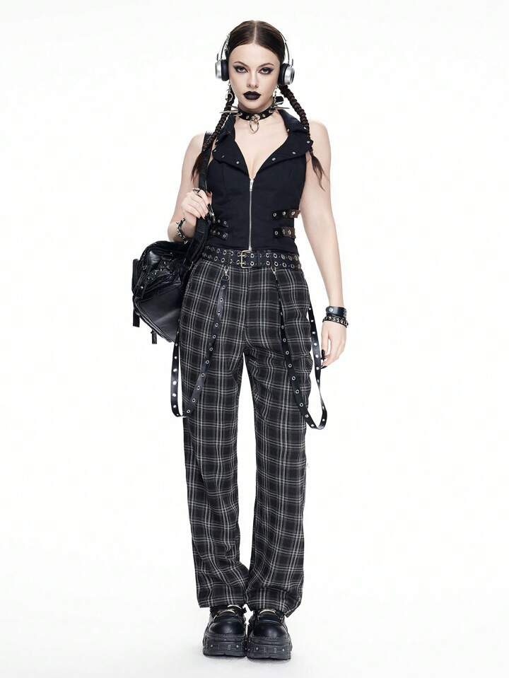 Goth Pantalon droit de style universitaire casual à carreaux pour femmes