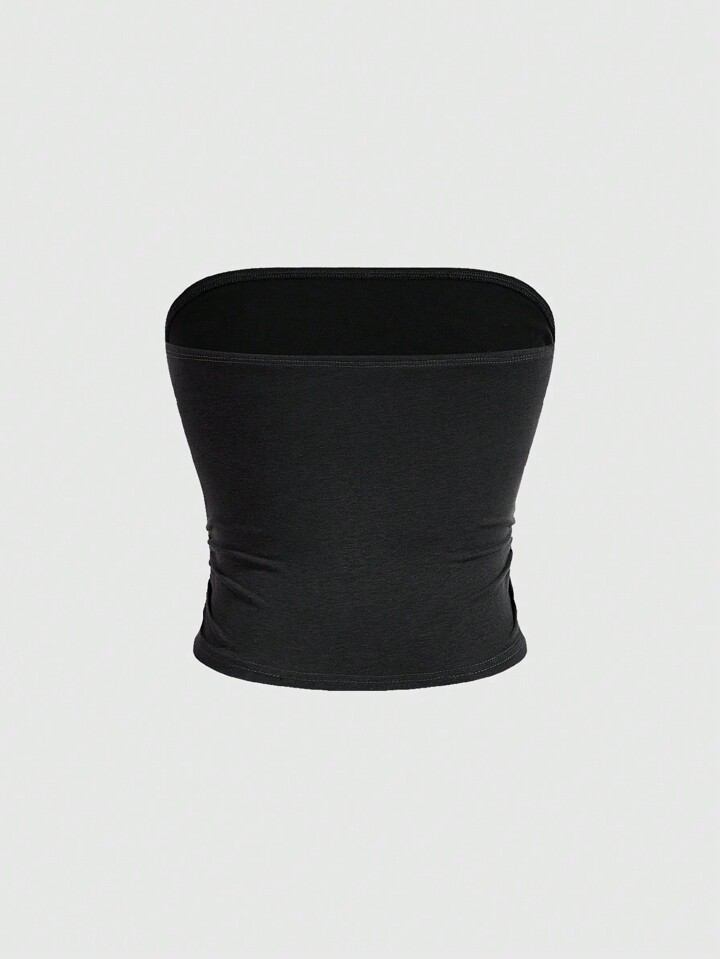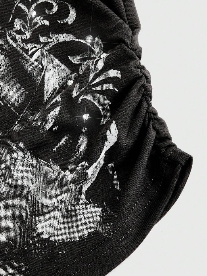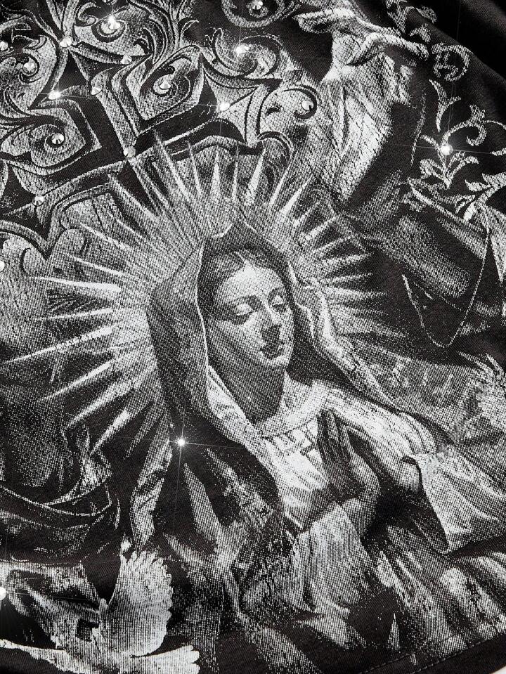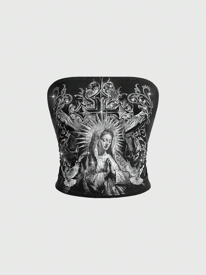 Goth Top sans bretelles en coton gris foncé avec imprimé intégral pour femmes, motifs croix et Vierge Marie ornés de strass. Coupe décontractée et ajustement régulier. Convient pour les sorties de printemps/été et les tenues de soirée/club.