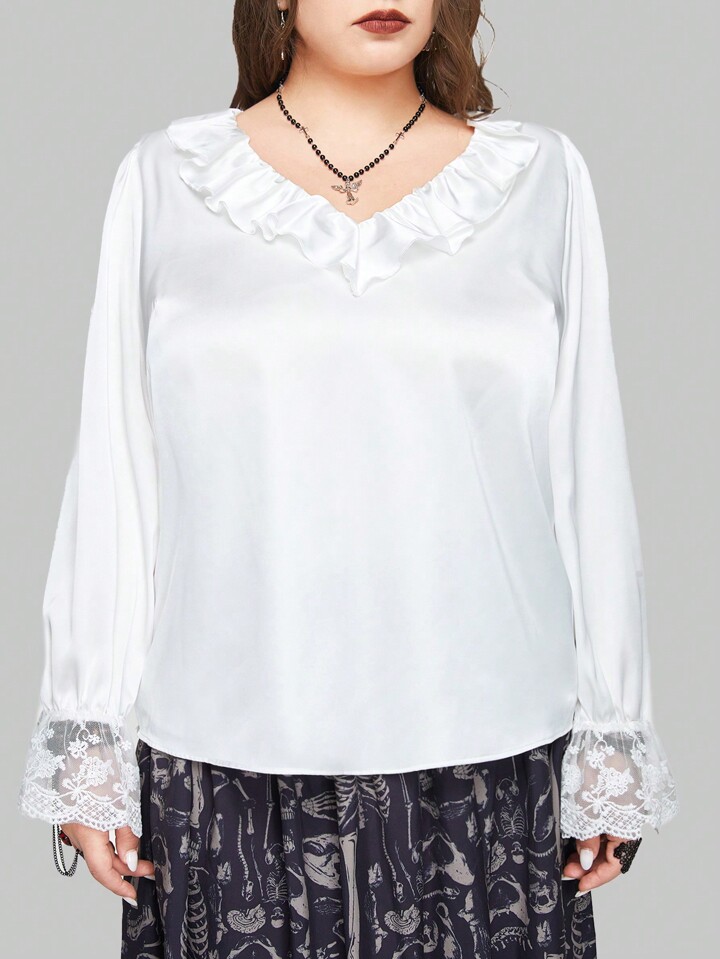Goth Chemise Décontractée Pour Femmes De Grande Taille De Couleur Unie Avec Garniture À Volants Décorée